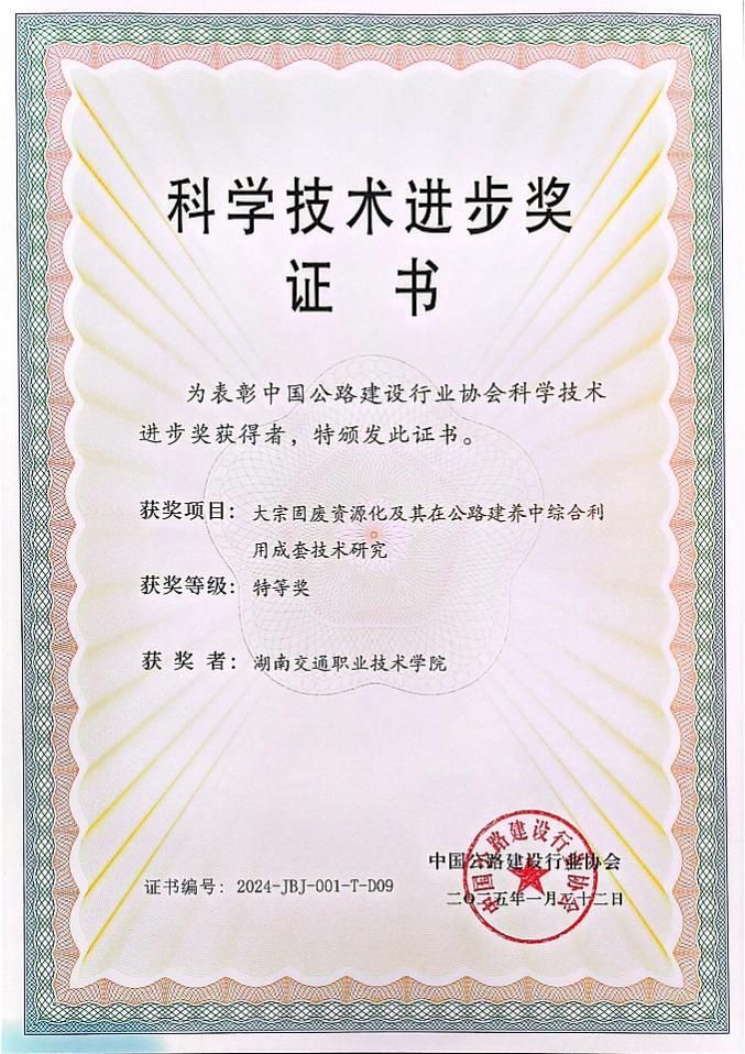 近日,由湖南交通职业技术学院牵头完成的“大宗国废资源化及其在公路建养中综合利用成套技术研究”,荣获中国公路建设行业协会科学技术进步奖“特等奖”,这是“道路与轨道交通绿色建造与数智运维工程技术研究中心”在绿色交通与资源循环利用技术领域取得的又一重大应用研究成果。研究中心教师创新团队聚焦大宗废弃物处理痛点,研发出成套利用技术,将废弃物转化为公路建养资源,既有效减少固废污染,又显著降低公路建设对原生材料的依赖,实现了环保效益与经济效益的双赢。