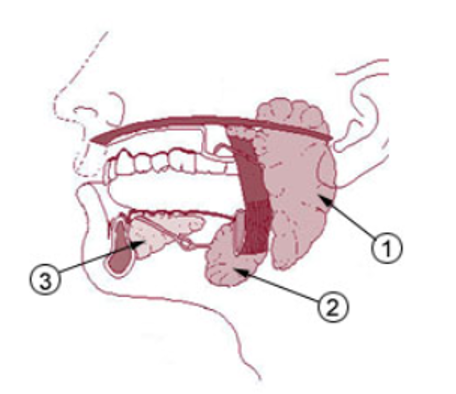 图注:人体三大唾液腺:①腮腺 ②颌下腺 ③舌下腺