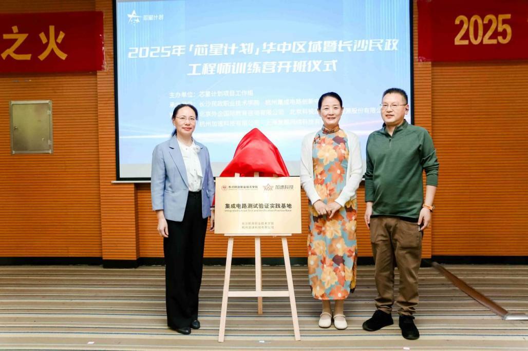 活动中,刘亚琴与邬刚共同为长沙民政职业技术学院-杭州加速科技有限公司“集成电路测试验证实践基地”揭牌。该基地配备了行业领先的ATE测试设备,年培训规模预计达200人次,引入企业真实项目案例库,助力学生实现“毕业即上岗”,进一步夯实学校实践教学根基。