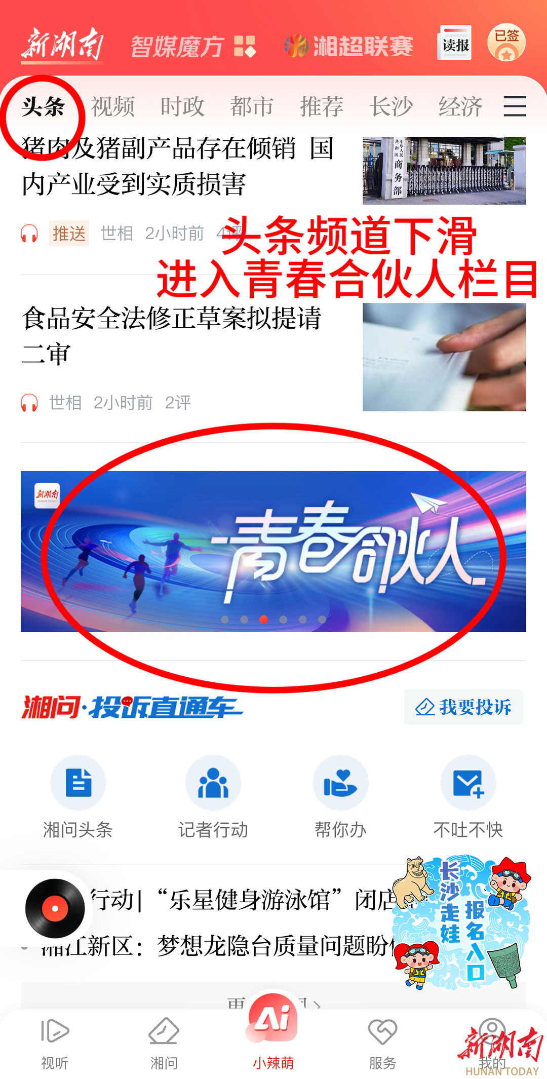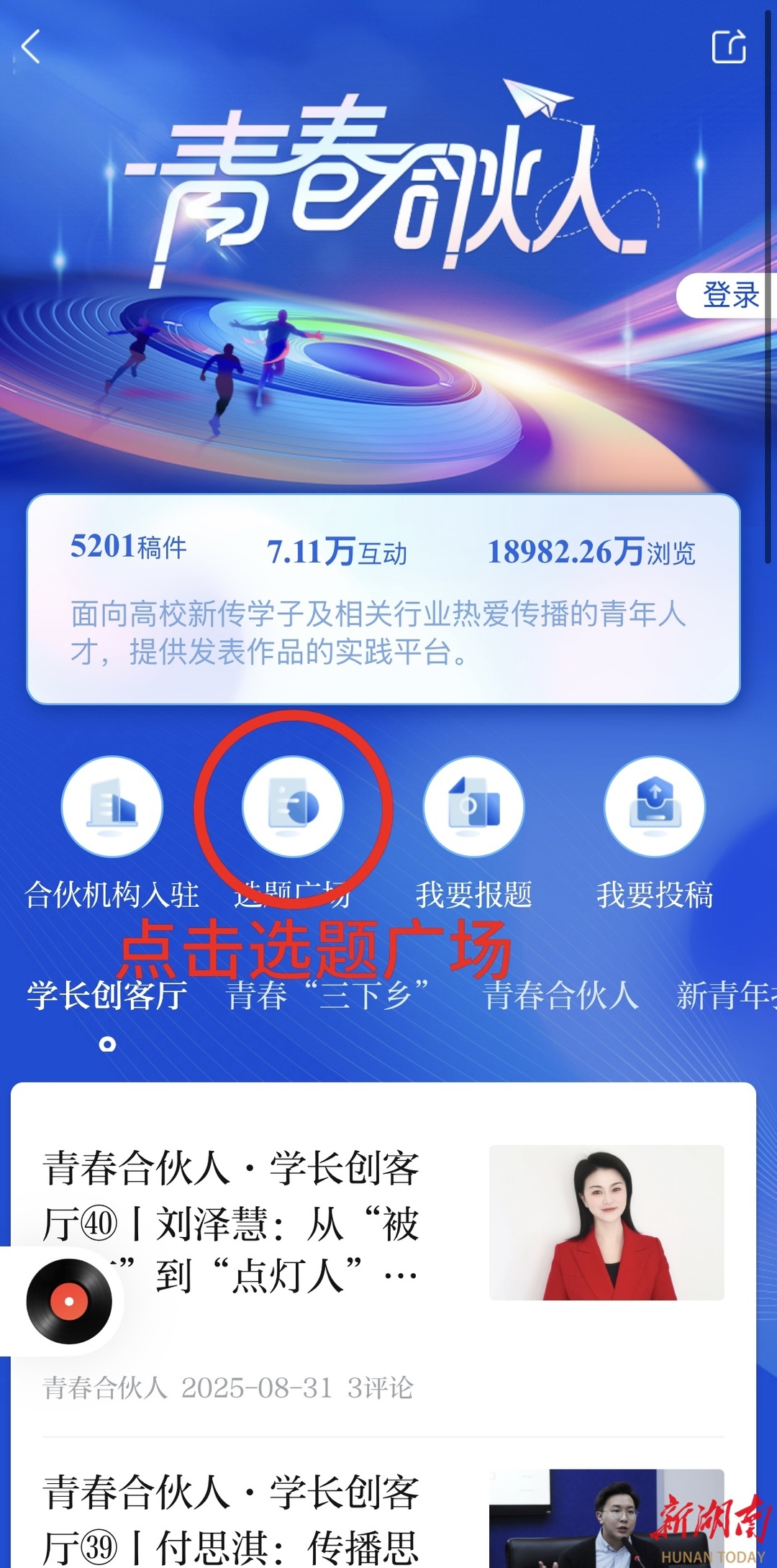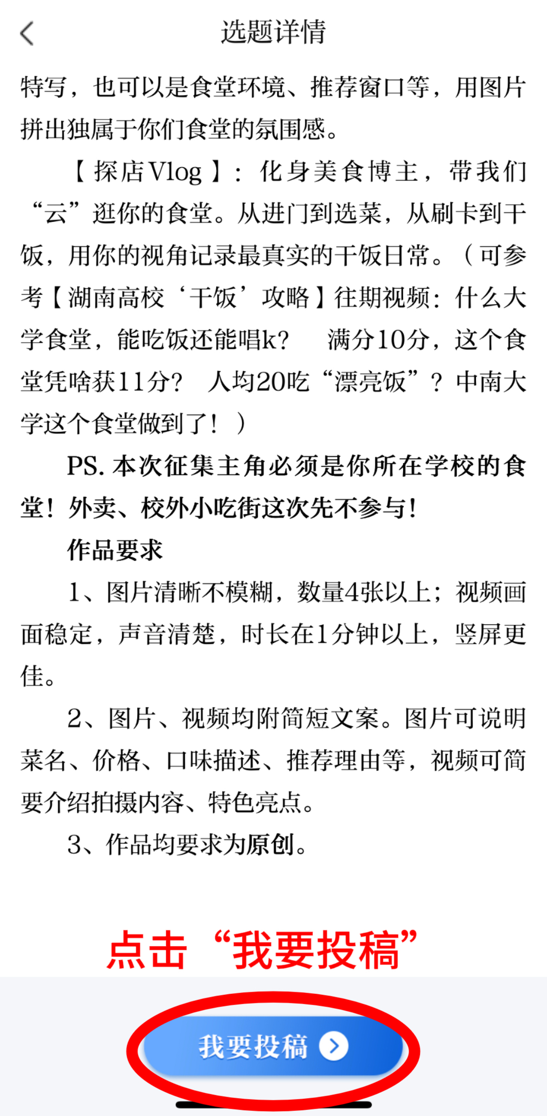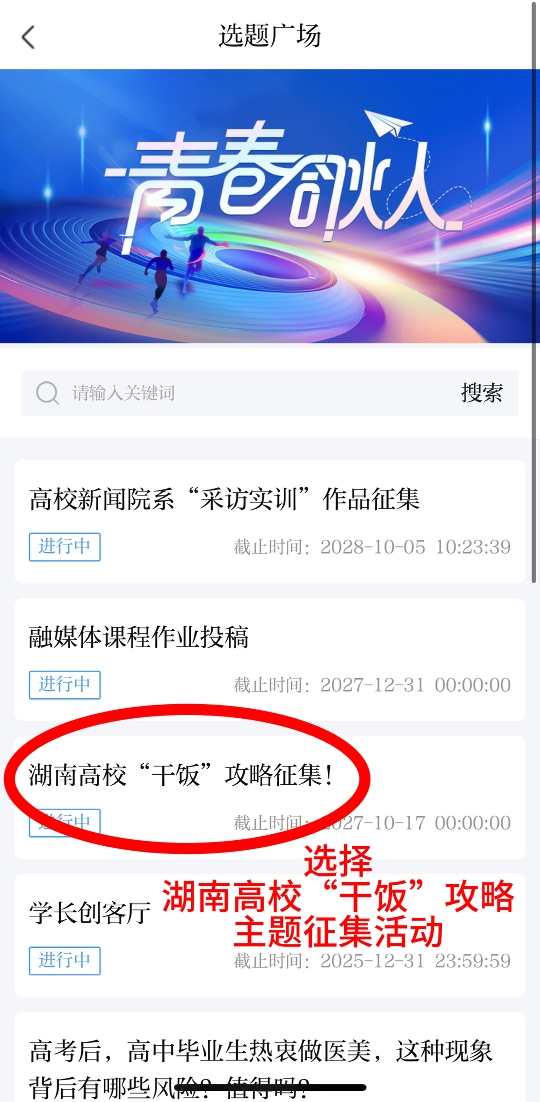 下载新湖南app—登录注册—进入青春合伙人栏目—进入选题广场—选择“湖南高校‘干饭’攻略”主题征集活动—点击“我要投稿”
