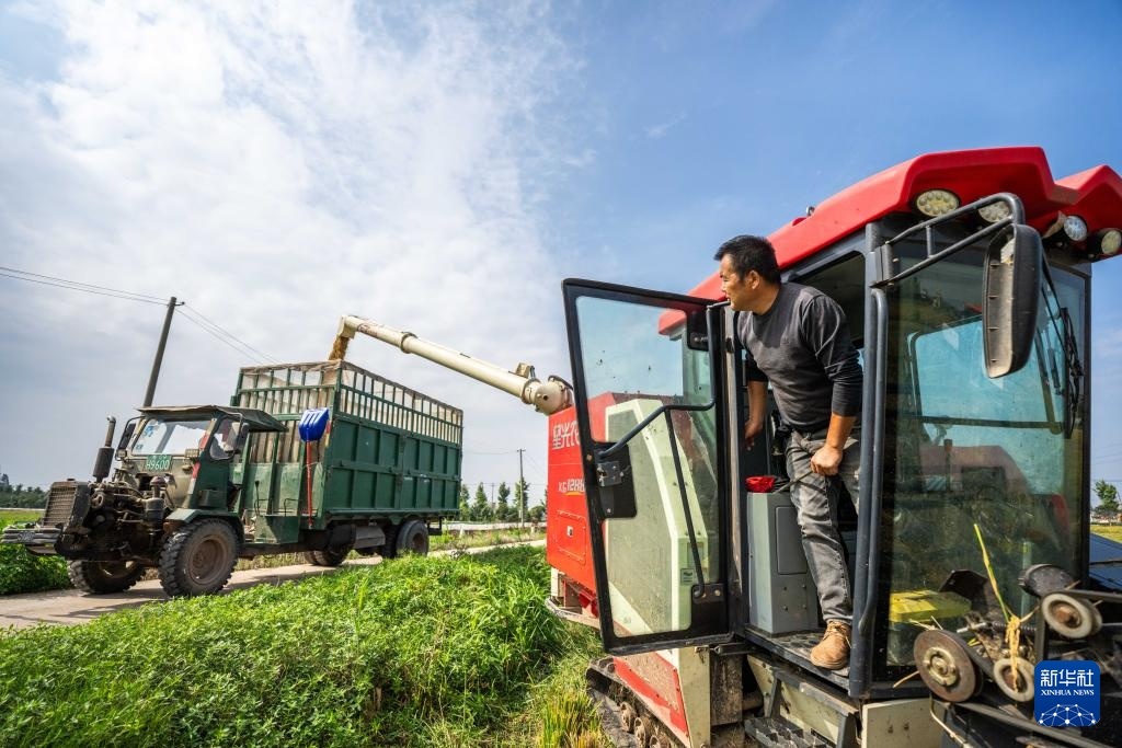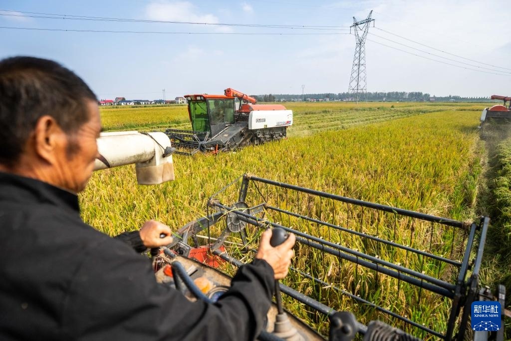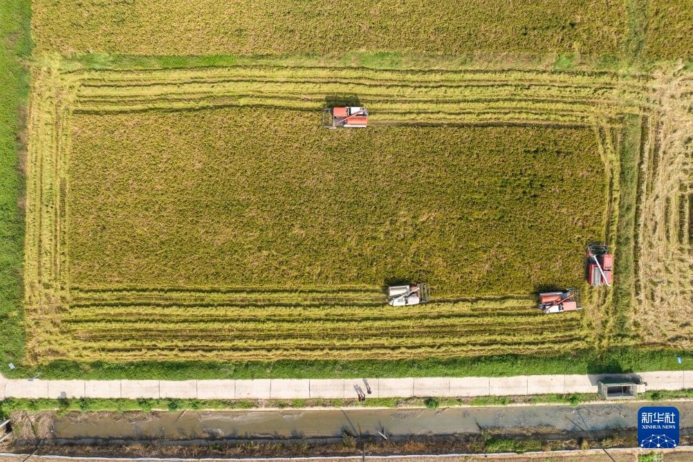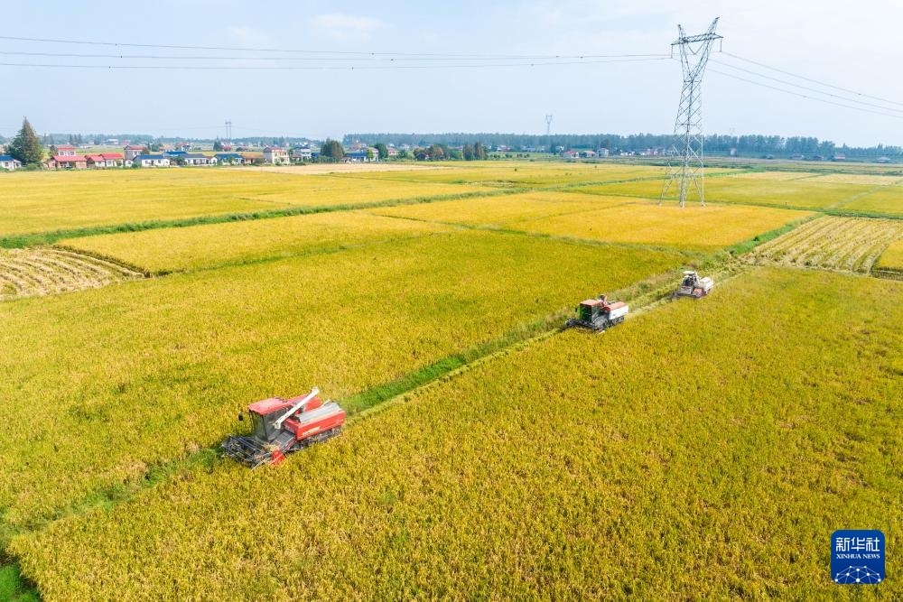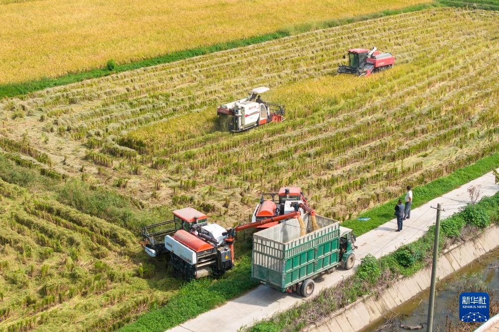近日,位于洞庭湖腹地的湖南省益阳市南县60余万亩中晚稻陆续成熟进入收割期,当地农民抢抓晴好天气,操作机械设备进行收割,田间地头一派丰收景象。