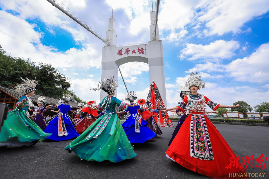在文化品牌打造上,矮寨・十八洞・德夯大峡谷景区自2013年起,连续举办九届鼓文化节,每年同步开展百狮会、赶秋节等苗族特色活动,让“百年路桥奇观、千年民族风情、万年峡谷风光”走向全国乃至世界。2023年至2025年9月,矮寨大桥景区共接待国内外游客310.3万人次,开展研学游560批,达13.9万人次;乾州古城景区则依托全省首批海峡两岸交流基地和全省华侨文化交流基地等品牌,2025年打造“非遗研学+国学”活动125场,接待研学群体1.4万人次,推动民族文化活态传承。