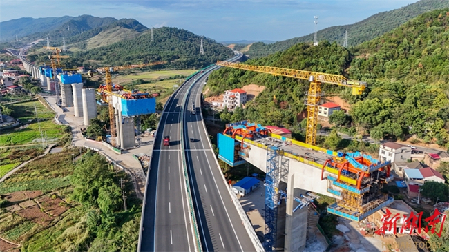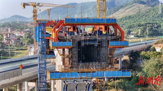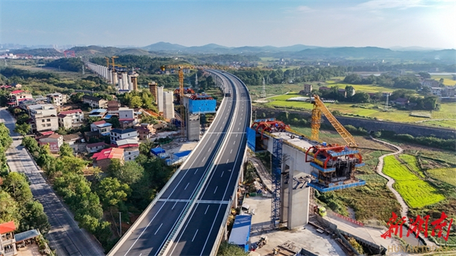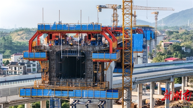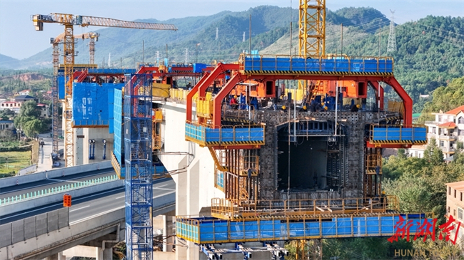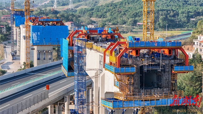 The photo, taken on October 15, shows the busy construction site of the Luhong River Grand Bridge in Yongzhou City. It is undertaken by the China Railway 25th Bureau Group. The bridge, with a total length of 3050.955 meters, is a part of the Shaoyang-Yongzhou High-Speed Railway. Crossing the Yiyang-Zhanjiang Railway, Yongzhou-Lingling Expressway, a provincial highway, and a river, this bridge is one of the key and challenging projects along the entire line. The Shaoyang-Yongzhou High-Speed Railway is a crucial component of the Hohhot-Nanning Corridor within China's "Eight Vertical and Eight Horizontal" high-speed railway network. Upon completion, it will be of significant importance for improving the regional railway network layout and promoting the high-quality development in the central region of China. (Photo/Lei Zhongxiang)
