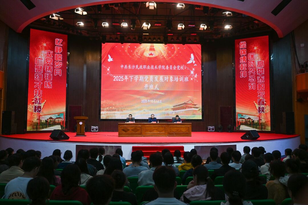 10月14日,长沙民政职院2025年下学期党员发展对象培训班正式开班。长沙民政职院党委书记李斌以《学习贯彻习近平总书记在纪念中国人民抗日战争暨世界反法西斯战争胜利80周年大会上的重要讲话精神 做新时代好青年》为题,为全体学员讲授专题党课。长沙民政职院党委副书记周立华出席并讲话,党委委员、组织人事部部长曾万里主持开班,179名党员发展对象参加。