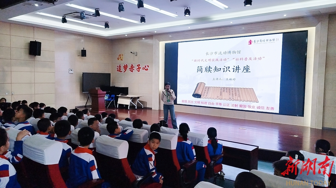 科教新报·新湖南客户端讯(通讯员 徐电)为弘扬中华优秀传统文化,丰富校园文化生活,10月17日,长沙简牍博物馆的金牌讲解员王姝婷老师走进浏阳河小学,为四年级学生带来了一场别开生面的“竹木载文明”简牍文化讲座。此次活动不仅是一次知识的启蒙,更标志着馆校携手,共同播撒文化传承的种子。