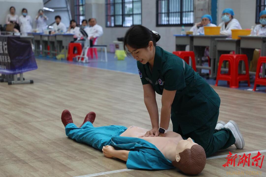 与此同时,该校体育馆内更是热闹非凡,这里被划分为中医科普区、中药材展示区和科技体验区三大区域,一系列沉浸式体验活动有序开展。活动伊始,中医院的工作人员率先带领师生们进行八段锦现场教学,他们耐心示范每一个动作的要领,一招一式讲解细致、指导到位。师生们跟随着节奏认真练习,在一招一式中感受传统养生文化的独特魅力。接着,应急救护演示环节吸引了全场师生的目光。中医院医护人员详细讲解了心肺复苏和海姆立克急救法的适用场景、操作步骤及注意事项,并利用人体模型进行了现场操作演示。