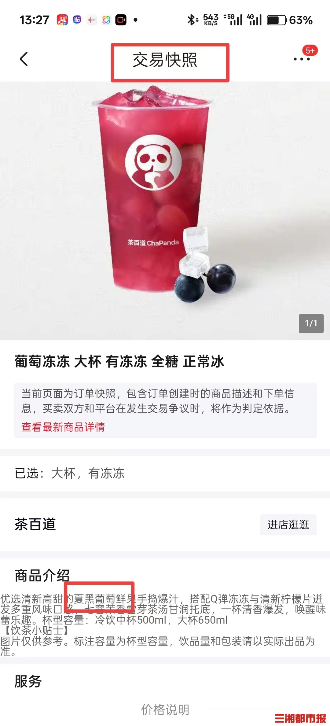 张先生提供的订单交易快照信息显示,他所下单产品的页面上明确表示葡萄品种为夏黑葡萄。因此,他认为茶百道在未提前告知的情况下擅自更换葡萄品种导致籽多等问题,已经构成了宣传与实际不符的虚假宣传行为。