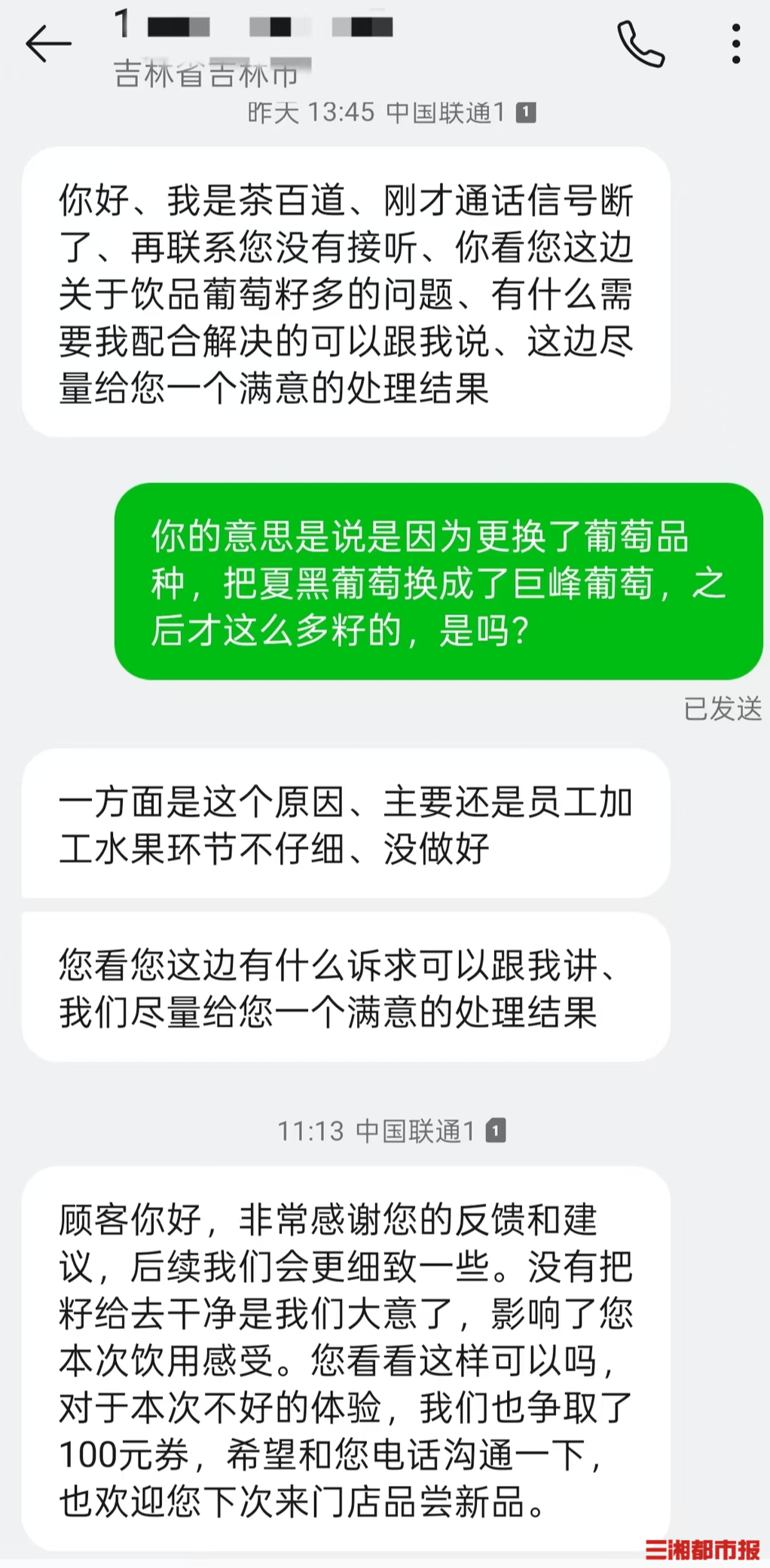 张先生联系茶百道在线客服反馈上述情况后,10月16日,茶百道门店解释称,出现葡萄籽是因为门店把夏黑葡萄更换为了巨峰葡萄,同时,员工加工水果不仔细,导致会有葡萄籽多的问题。