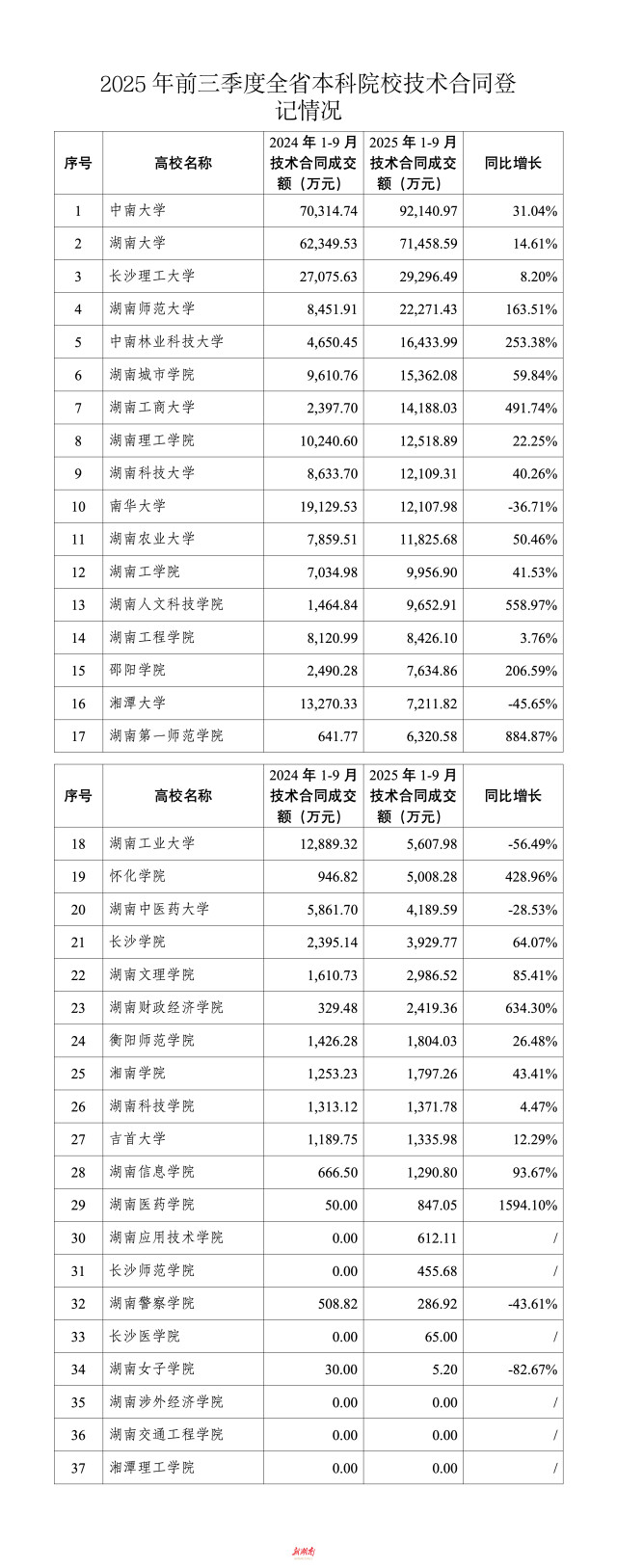 湖南日报10月17日讯(全媒体记者 王铭俊)日前,湖南省科技厅公布2025年前三季度全省本科院校技术合同交易数据,湖南11所本科院校技术合同成交额破亿元。