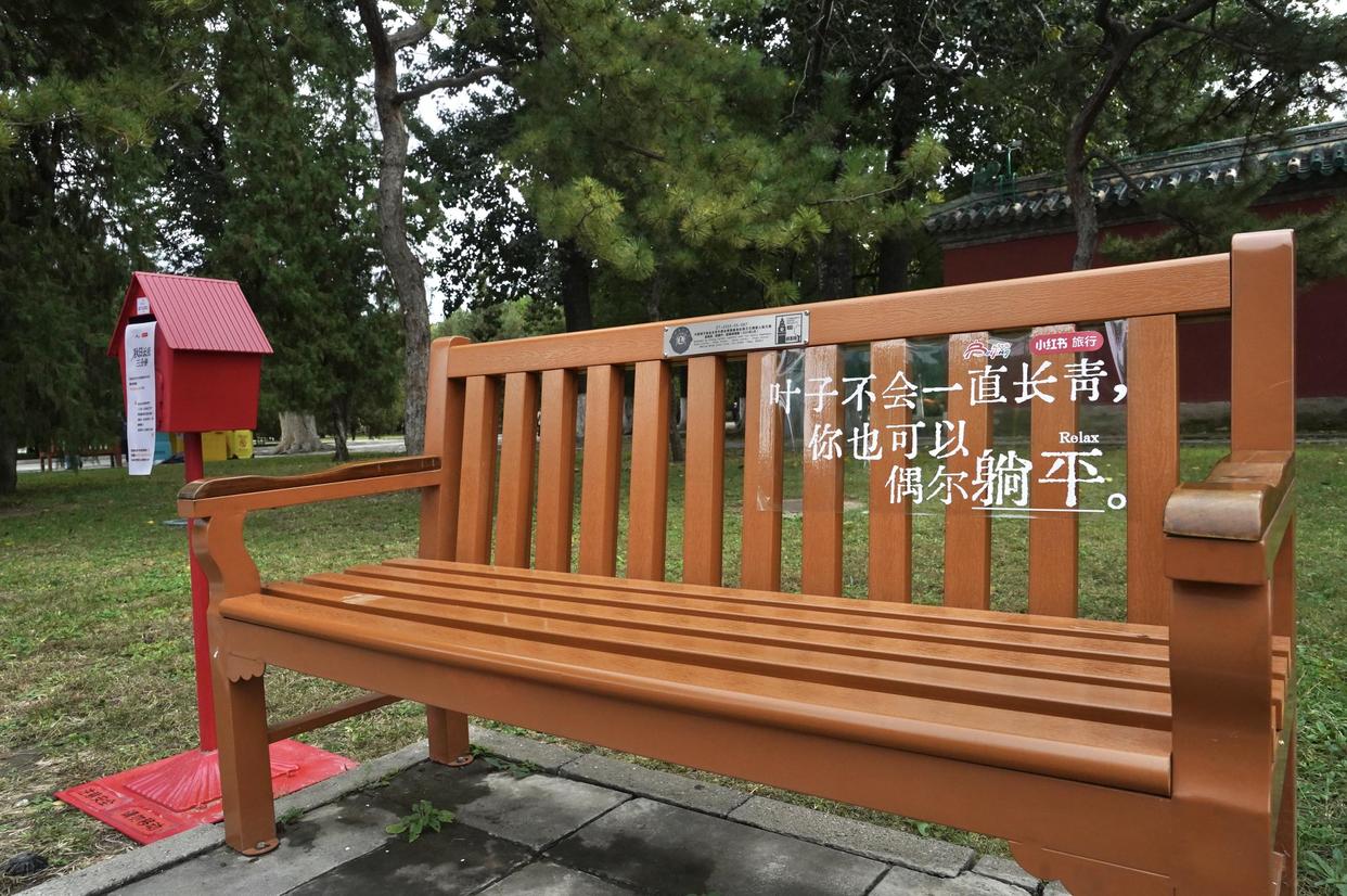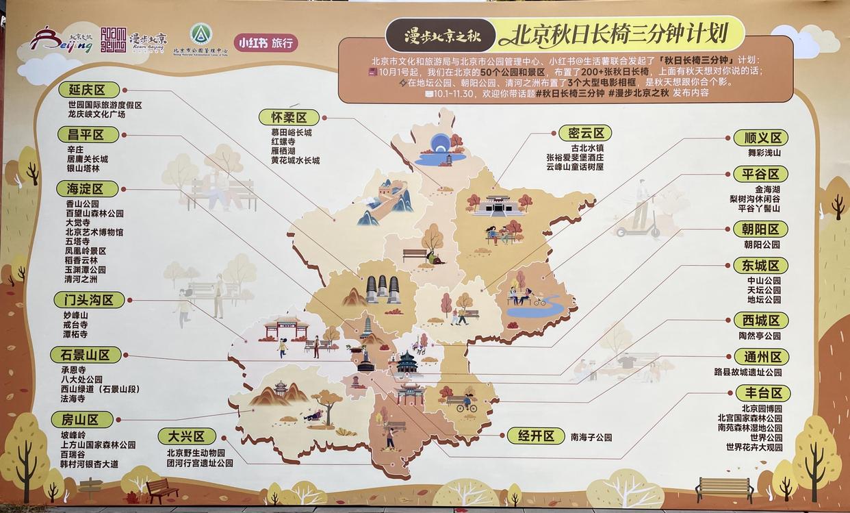 “漫步北京之秋·秋日长椅三分钟”计划,在公园和景区等50个北京绝佳赏秋地布置了200余张秋日长椅,上面有秋天对市民和游客说的话;在地坛公园、朝阳公园、清河之洲布置了3个大型电影相框,邀请市民和游客跟秋天合个影,营造沉浸式赏秋体验。