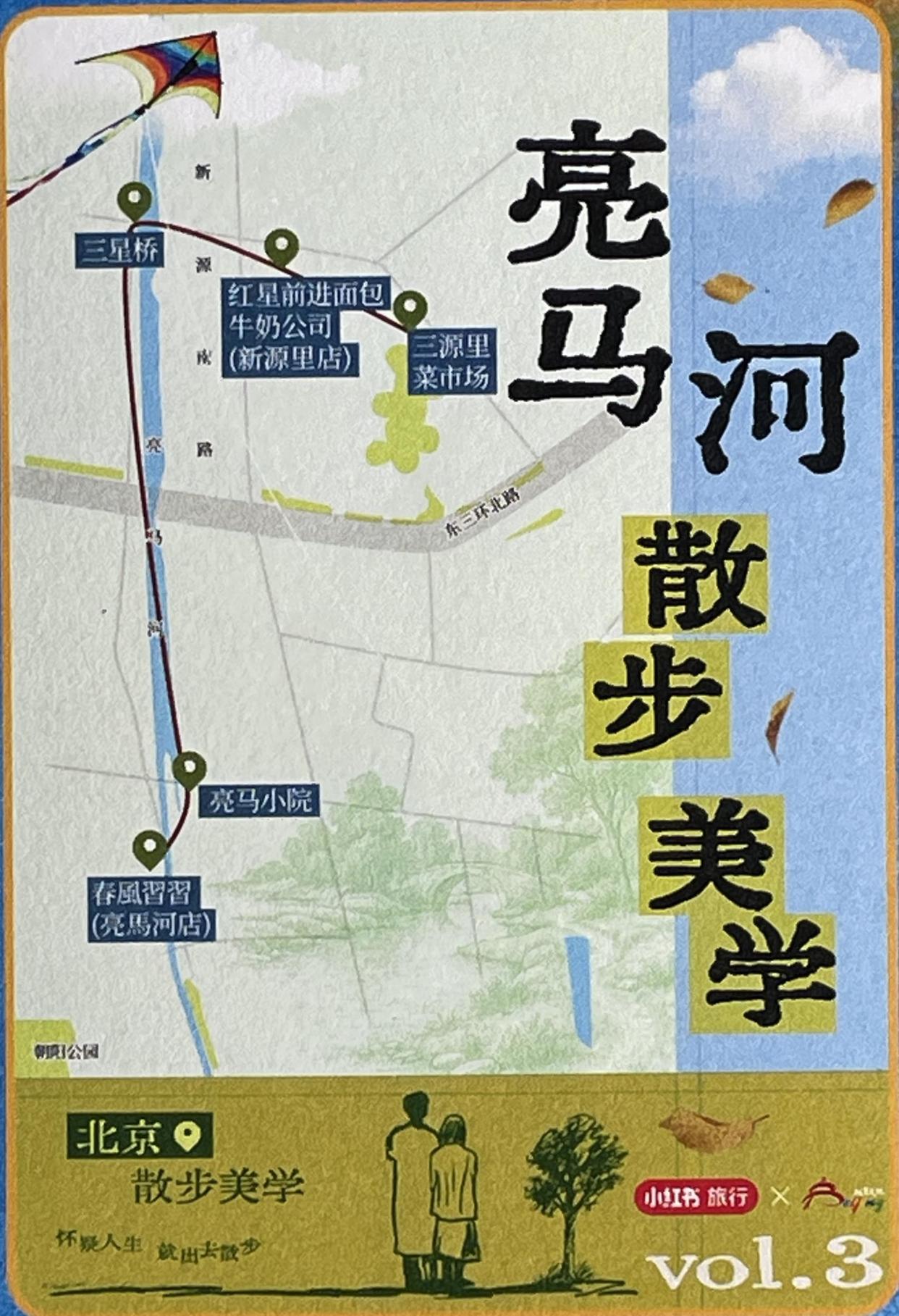 亮马河散步美学路线则以现代都市滨水空间为核心,引导游客从三源里菜市场、红星前进面包牛奶公司出发,沿亮马河途经亮马小院、春风習習书店至朝阳公园,融合国际化生活氛围与城市慢行体验。