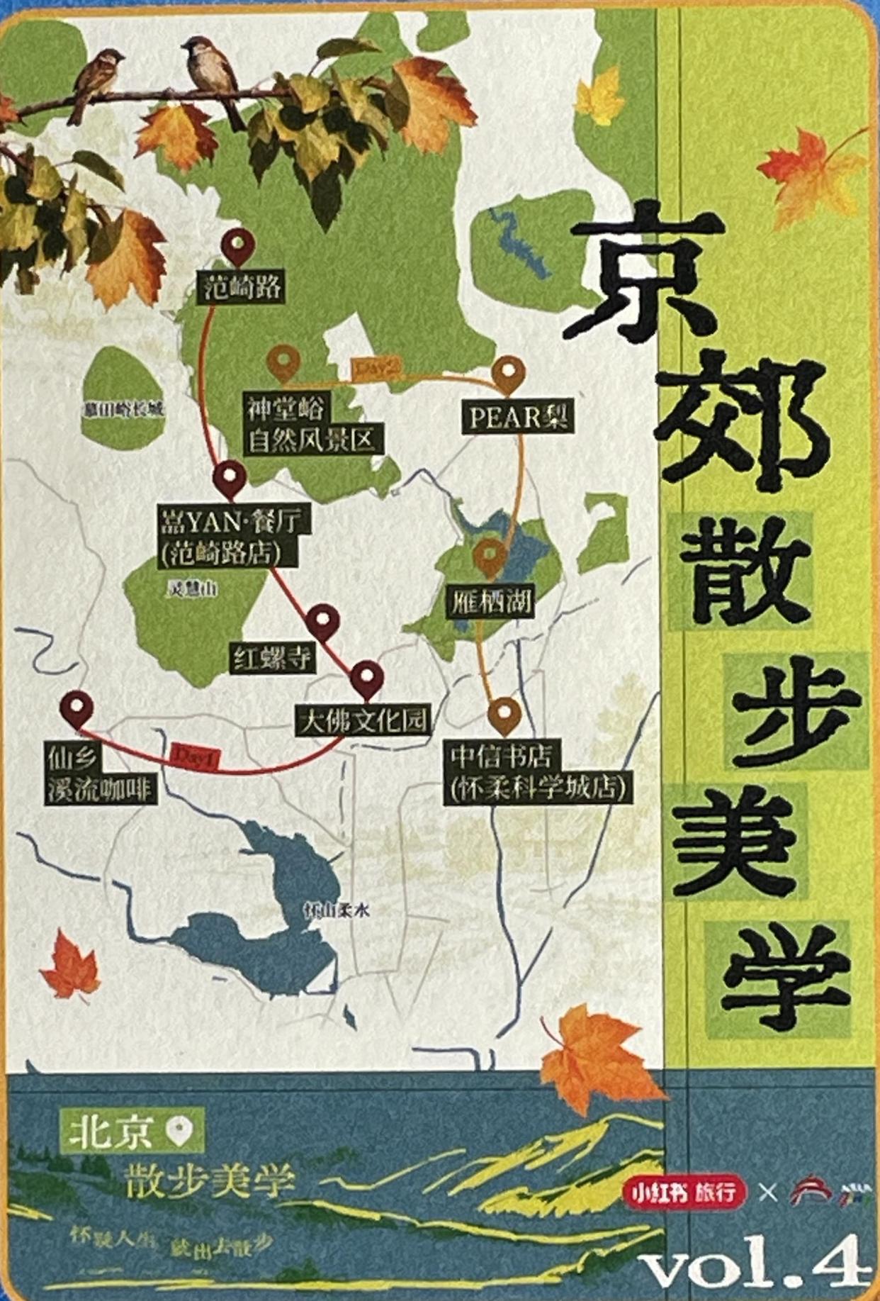 京郊散步美学路线推出怀柔区域两日游线路,从仙乡溪流咖啡经红螺寺、大佛文化园至范崎路,从神堂峪自然风景区经PEAR梨餐厅至中信书店,融合自然山水与休闲文化体验。