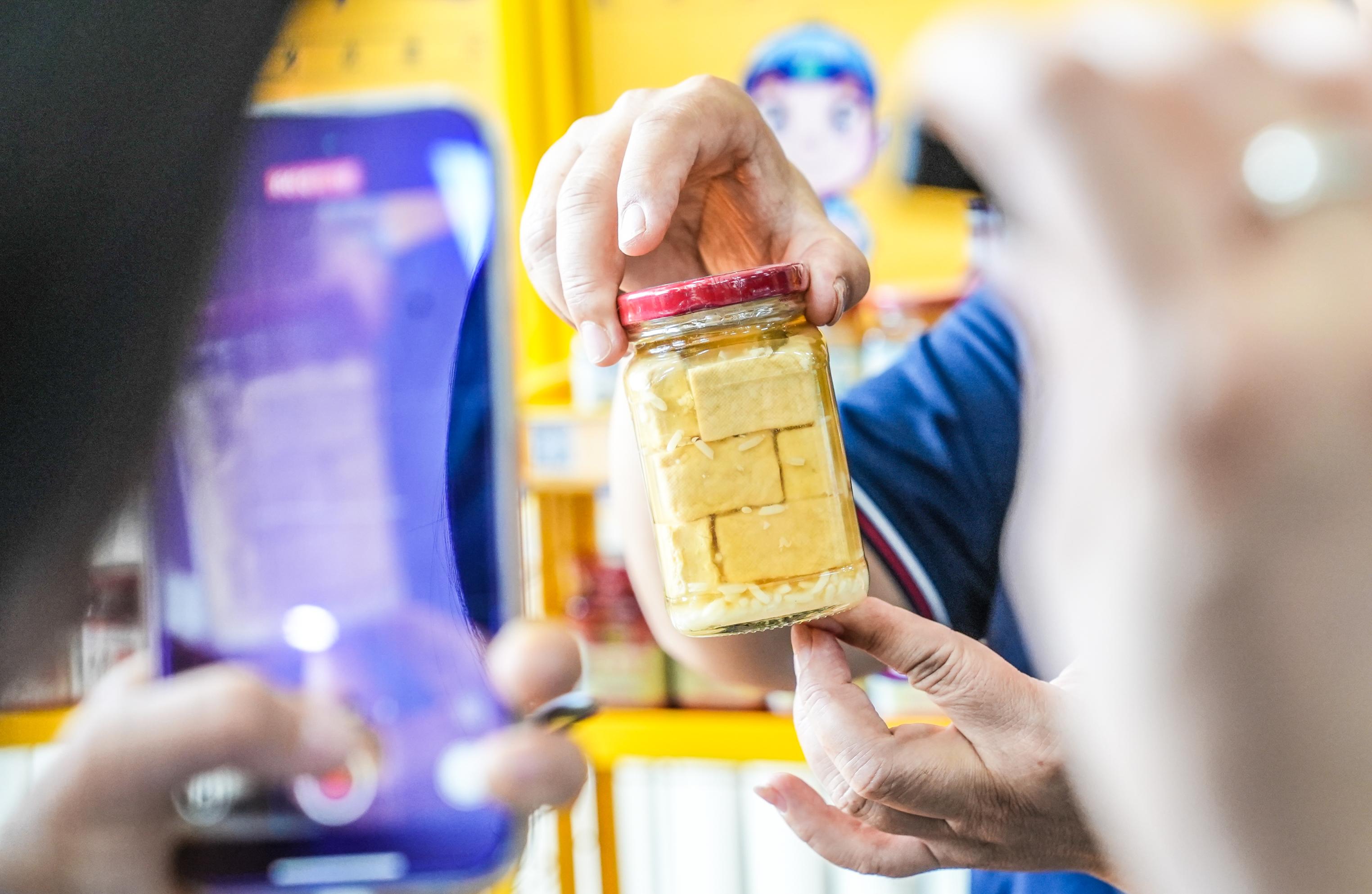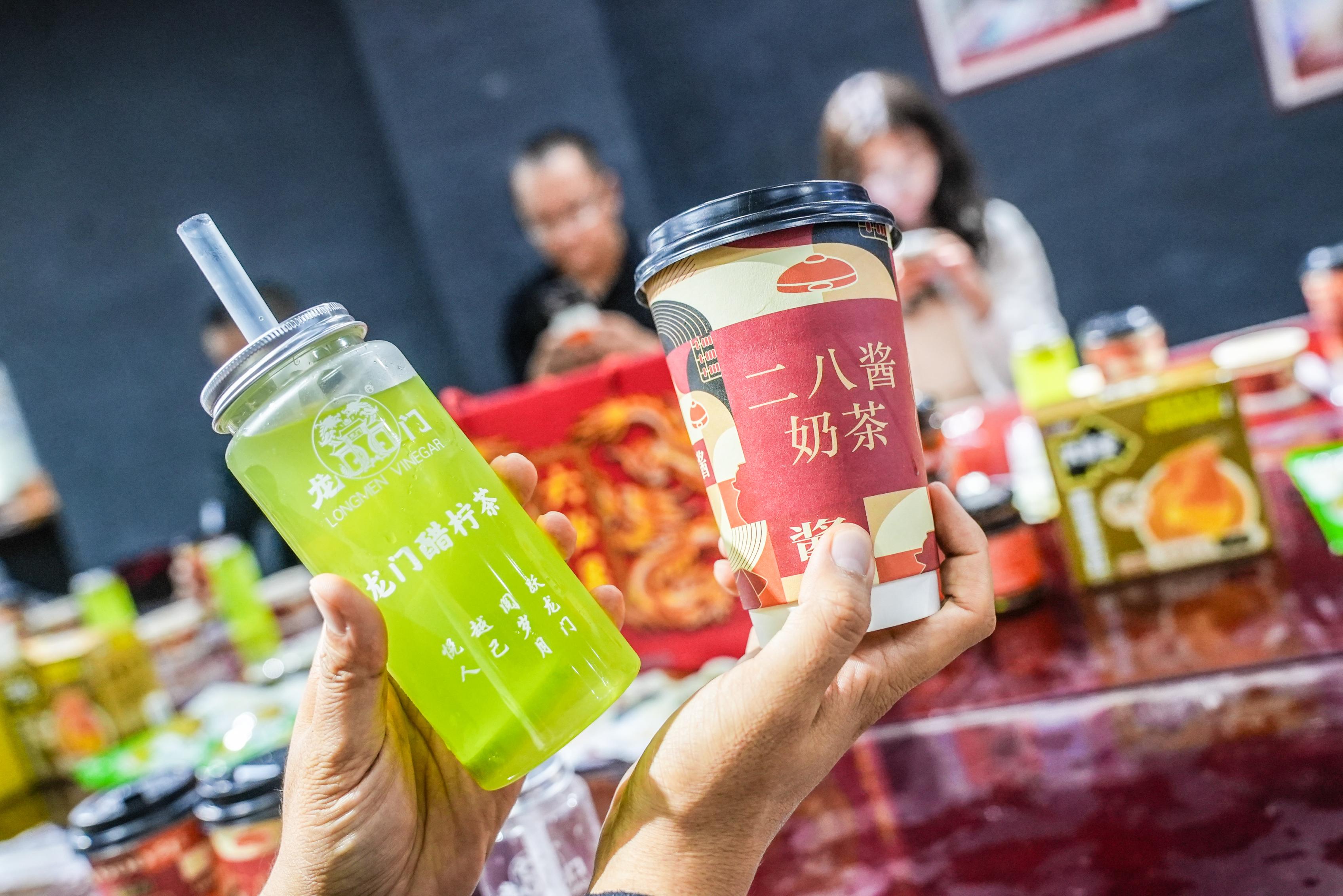 图为消费者展示六必居现制现售的二八酱奶茶、龙门醋饮料。如今,六必居不仅将传统酱菜的老味道保留下来,创新的黑蒜冰淇淋、二八酱系列新品亮相,掀起打卡热潮,受到年轻消费者好评。