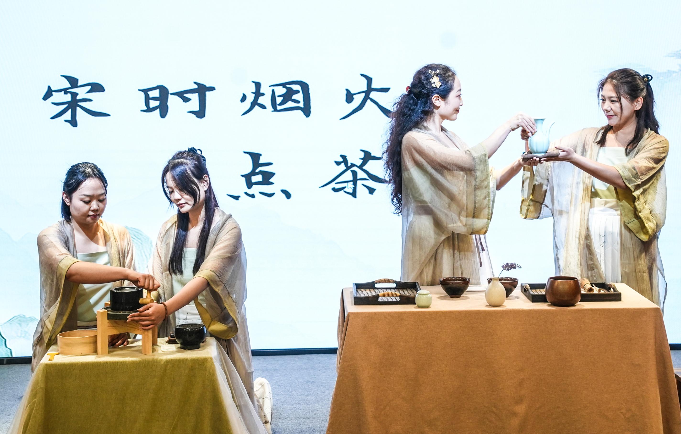 成立于1950年的京华茶业,拥有新中国第一批茶叶类注册商标“京华”品牌。京华茶业拥有西城区非物质文化遗产北京花茶拼配工艺,目前已传至第七代传承人。图为京华茶叶工作人员在展示宋代点茶。