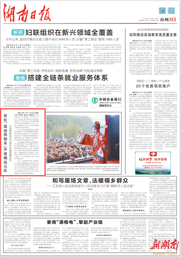 湖南日报10月17日讯(全媒体记者 雷鸿涛 通讯员 夏国翁)“包裹免费送上门,跟城里一样方便。”16日下午,接过“流动供销车”送来的包裹和当天下单的水果,安化县柘溪镇双桥村村民蒋望楼直呼“太快了”。以前,他要跑到10多公里外的柘溪镇才能取回自家的包裹。