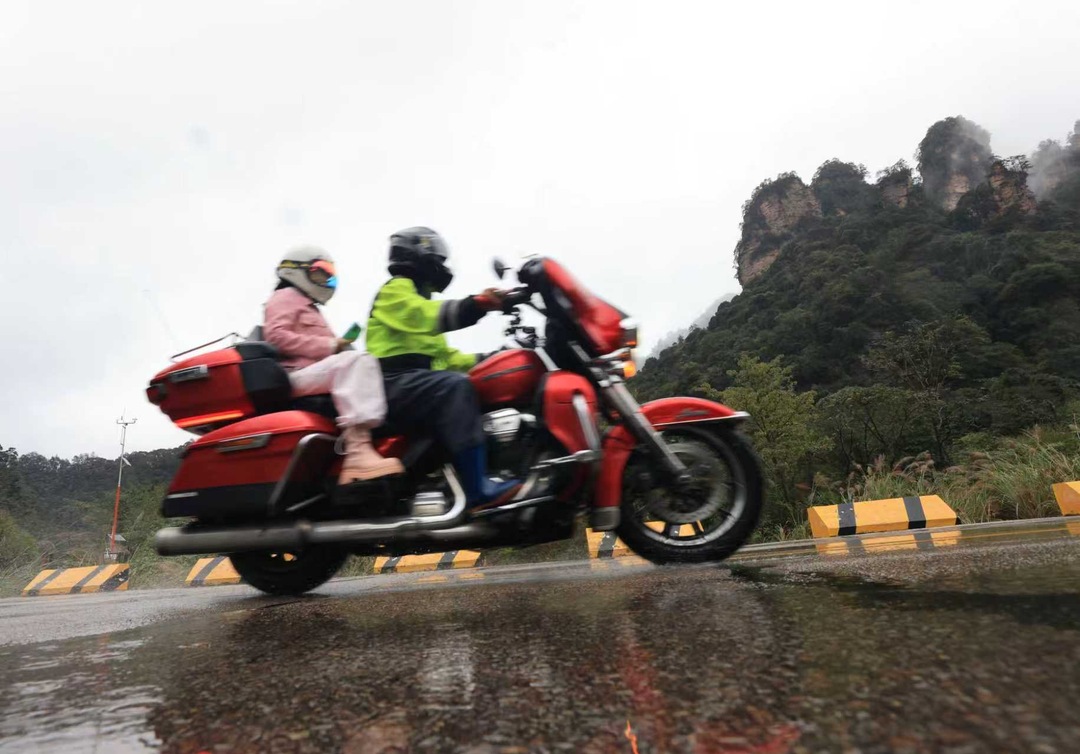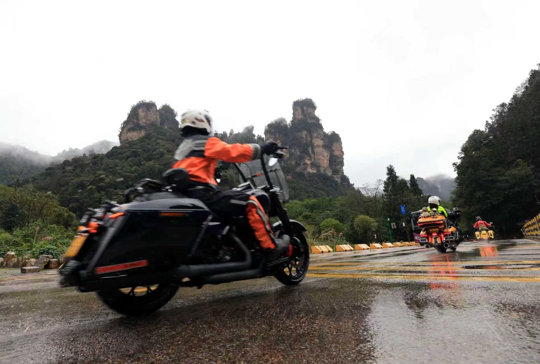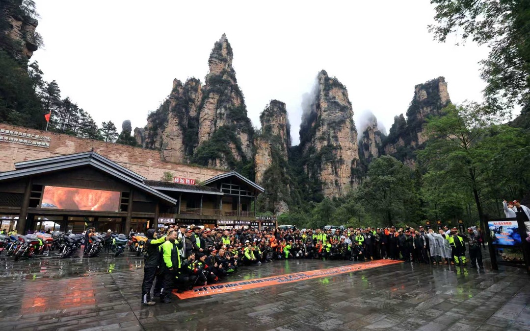 川、贵州等地的26支哈雷车主会(倶乐部)的260台机车相聚世界自然遗产地武陵源,共同演绎哈雷的轰鸣、风的速度和峰林山水激情相融的合奏乐章。据悉,本次活动由张家界市武陵源区文化旅游和商务局、哈雷长沙车主会主办,主题是”骑遇张家界 沉浸武陵源”。吴勇兵摄