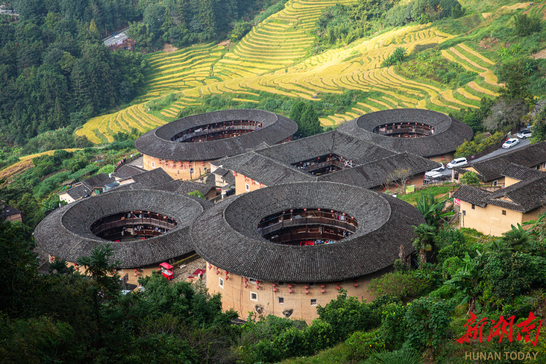 转至田螺坑,“四菜一汤”的土楼群错落于梯田之间。朝阳下层层稻田泛出金黄,与土楼墙体赭黄相映生辉。这让我们真正感受到了土楼与青山绿水浑然一体,宛如大地自然生长而出的完美诗篇。
