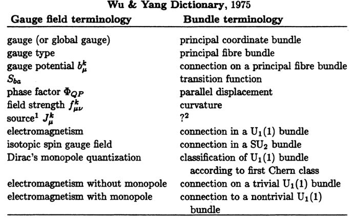 当我认识到规范场理论的方程其实是数学中的一个理论,也就是纤维丛理论方程的一个特例,我感到非常的吃惊。我曾经和纤维丛理论的创始人之一陈省身先生有过一段对话。在一篇1979年纪念爱因斯坦百年诞辰的文章中,我这样回顾了这段对话:1975年,规范场和纤维丛之间存在关联这个事实深深打动了我,所以我驱车前往伯克利附近的埃尔塞里托,去陈省身先生家中拜访他。(在20世纪40年代早期,我曾经上过陈先生的课。他当时是中国昆明西南联合大学的一位年轻教授,而我是西南联大的本科生。那时候,纤维丛理论还没有成为微分几何领域中的重要理论,陈先生也还没有因为他在广义高斯-博内理论和陈类(Chern classes)方面的重要贡献而被载入史册。)我们聊了很多话题:朋友、亲戚、祖国。聊到纤维丛的时候我说,从吉姆·西蒙斯(Jim Simons)那里,我终于体会到了纤维丛理论的美,也了解了深奥的陈-外尔定理。我说我对规范场与纤维丛之间的精确对应感到十分惊讶,数学家竟然可以在完全没有物理世界实际依据的情况下创造出这样的理论。我补充说“我既惊恐又疑惑,你们数学家可以凭空想象出这些概念来。”他马上反驳说:“不,不。这些概念不是凭空想出来的。他们是自然的、真实的。”