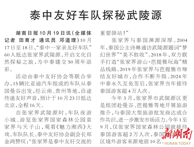湖南日报10月19日讯(全媒体记者 田育才 通讯员 邓道理)10月17日至18日,“泰中一家亲友好车队”60人抵达张家界武陵源,开启文化自然探秘之旅,为中泰建交50周年添彩。
