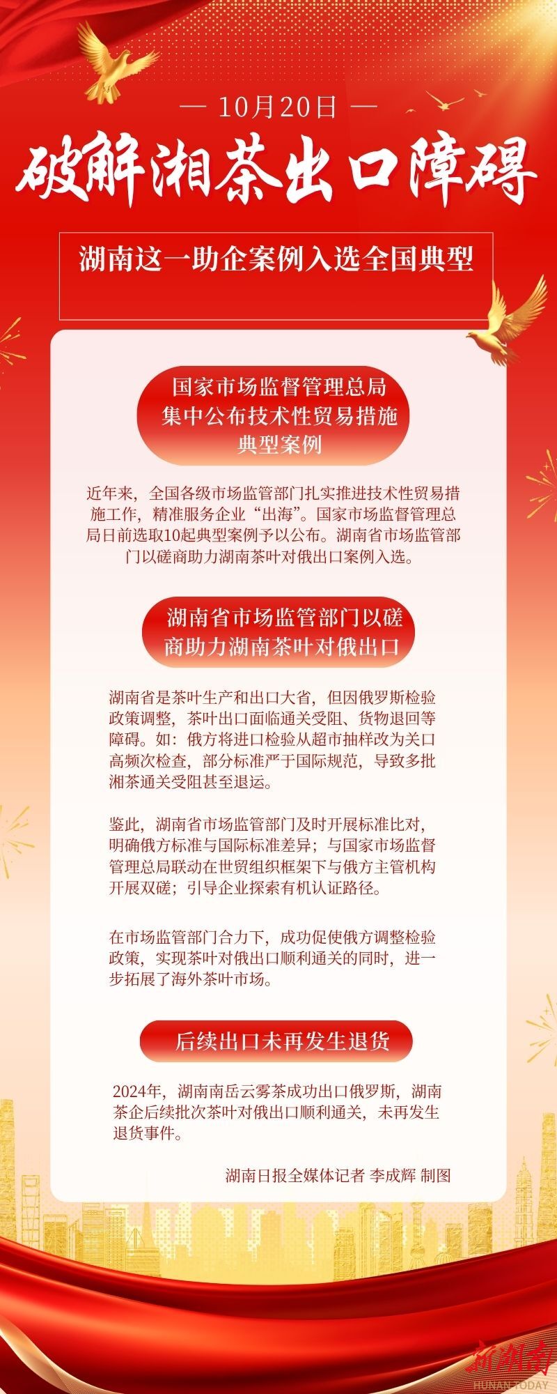 湖南日报·新湖南客户端10月20日讯(全媒体记者 李成辉 见习记者 李志 通讯员 黄屹)近年来,全国各级市场监管部门扎实推进技术性贸易措施工作,精准服务企业“出海”。国家市场监督管理总局日前选取10起典型案例予以公布。湖南省市场监管部门以磋商助力湖南茶叶对俄出口案例入选。