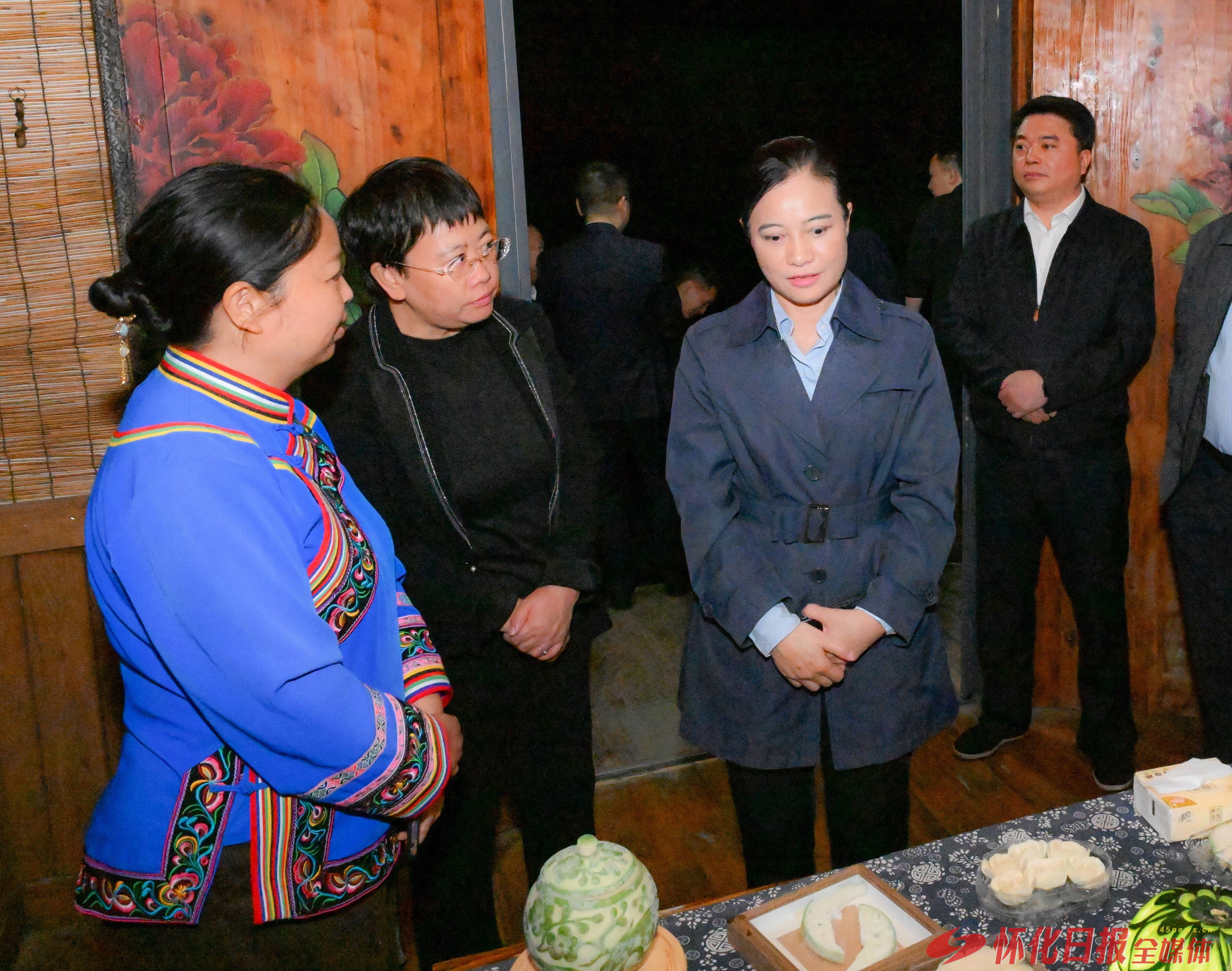 (10月19日,怀化市委副书记、市政府党组书记韦朝晖到靖州调研。图为韦朝晖在靖州知青园调研雕花蜜饯非遗项目。怀化日报全媒体记者 潘雨 摄)