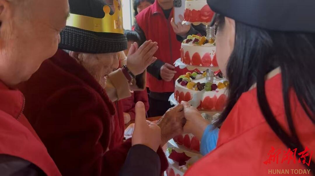 最热闹的环节当属切蛋糕。志愿者们扶着奶奶走到七层生日蛋糕塔前,蒋志新特意蹲下身,轻轻握住奶奶的手,一起切下第一刀。随后,他小心地撮起一小块蛋糕,递到奶奶嘴边:“奶奶,尝尝甜不甜。”“甜,真甜!”奶奶慢慢嚼着蛋糕,脸上的笑容比蛋糕还甜。很快,香甜的蛋糕分到了每个人手中,志愿者们和奶奶一起吃着蛋糕,分享着这份特别的喜悦,甜味从舌尖一直甜到了心里。