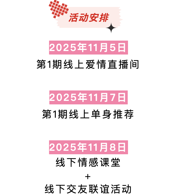 11月初,湖南工会将开通“线上爱情直播间”,根据单身职工自身条件和择偶要求,针对性推荐“心动对象”。而在线下交友联谊活动中,工会将设置甜蜜有趣的互动环节,创造面对面认识交流的机会,活动现场还配有专业情感导师,手把手带教实用交友礼仪与沟通技巧。