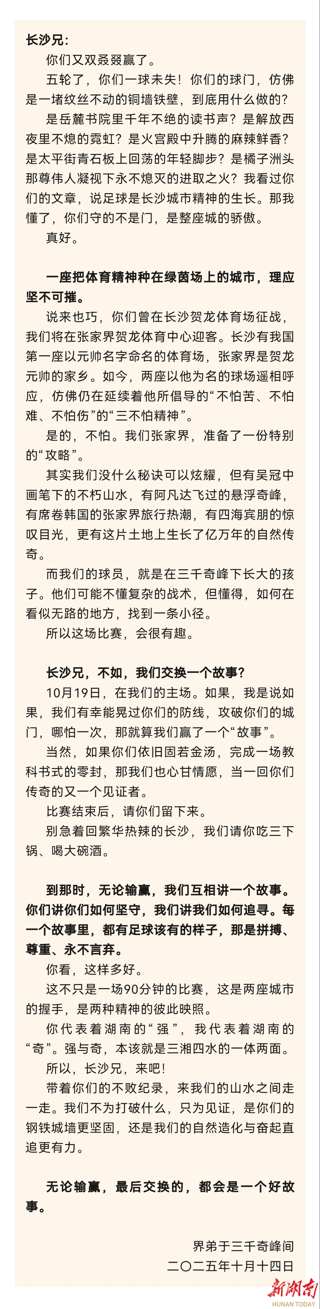 当“感情牌”打出温度与深度,当“故乡云”从心底的眷恋飘进可及的现实,当“走出去”的积累与“回故乡”的实干紧密相拥,湘超便不再只是一场足球赛事,更有望成为汇聚人才、资本与活力的强大磁场。