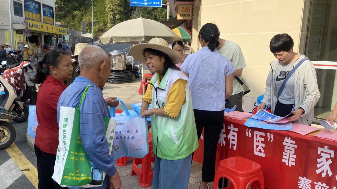 工作人员手持医保政策折页,向刚来赶集的群众细致讲解。摊位上,政策汇编、缴费指南等资料整齐摆放,印有“人人参保有‘医’靠,家家健康享平安”的宣传袋陆续分发,袋内附赠资料可详细解读参保、报销等核心问题。