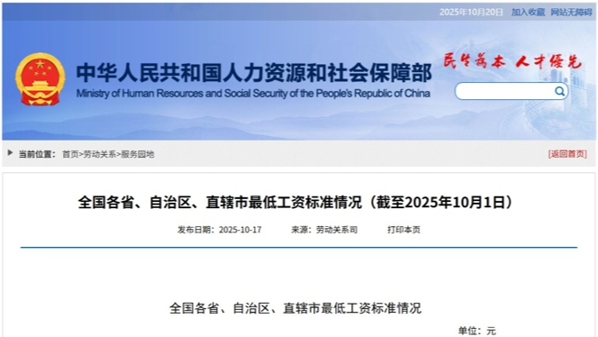 10月17日,人社部官网公布全国各省、自治区、直辖市最低工资标准情况(截至2025年10月1日)。