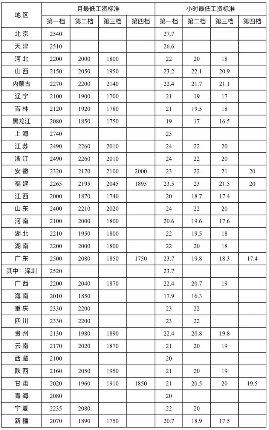 目前,最低工资标准档位最多为四档。数据显示,从月最低工资标准看,上海以2740元的标准居全国首位;从小时最低工资标准看,北京以27.7元的标准为全国最高。其中,江苏、浙江第一档月最低工资标准为2490元,第一档小时最低工资标准为24元。
