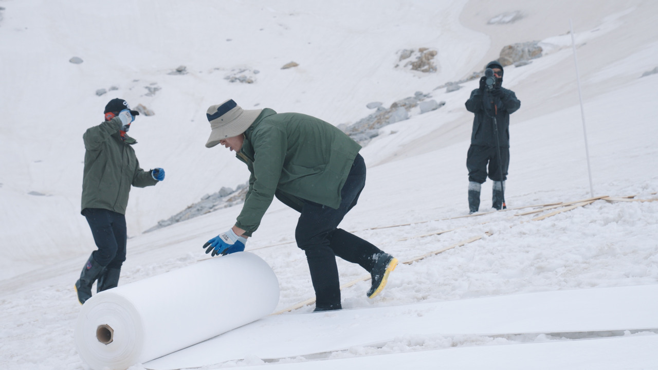 在中国海拔四千多米的地方,雪山巍峨中,有一群人正在努力给冰川“盖被子”。