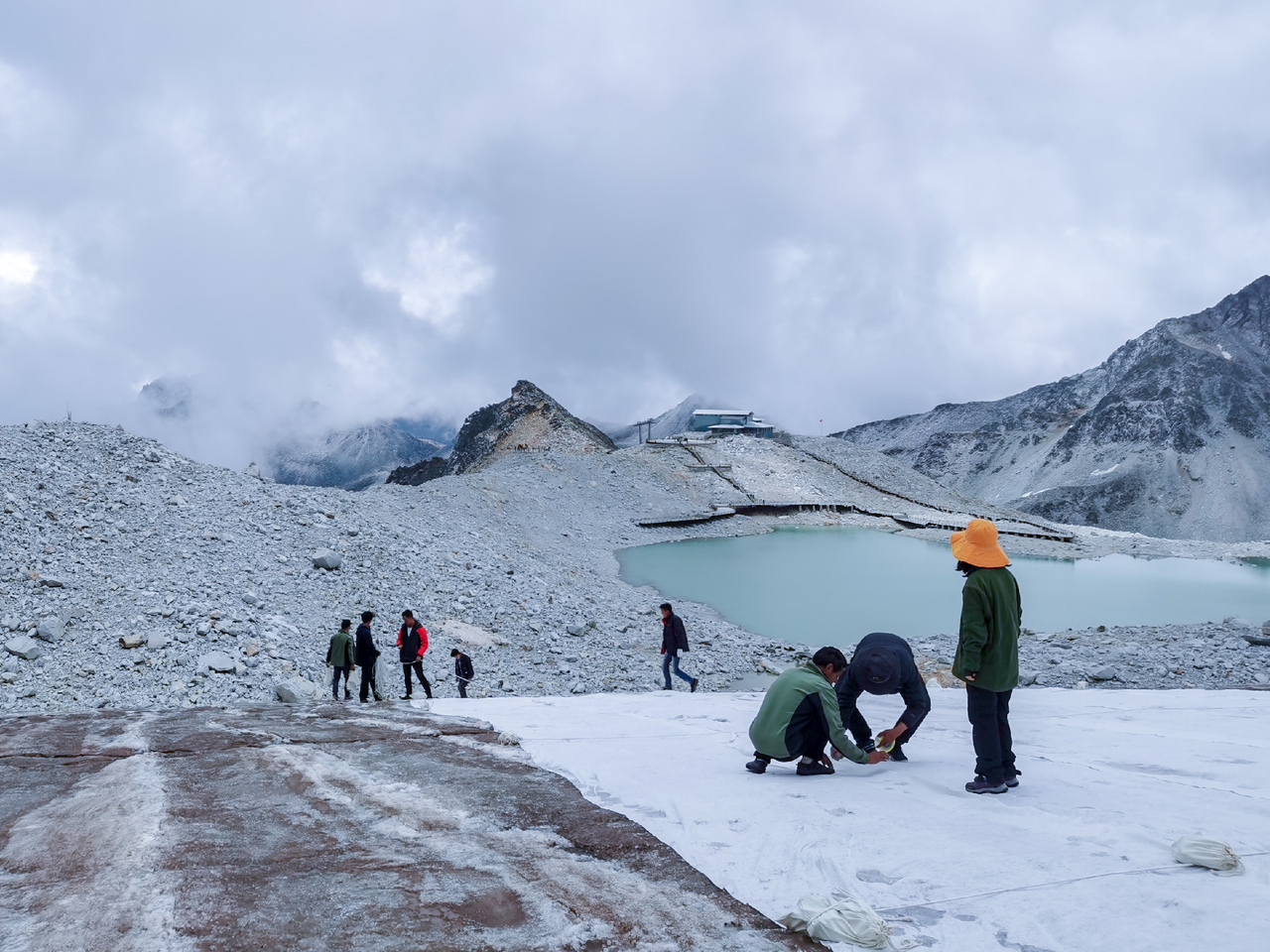 于是,2020年盛夏,王飞腾团队在达古17号冰川开展了全国首次冰川“盖被子”实验。首个实验场地为500平方米,科研人员从高海拔向低海拔铺设土工织布——一种涤纶等高分子聚合物制成的合成纤维。当时实验效果显示,能够减缓冰川消融1米/年。