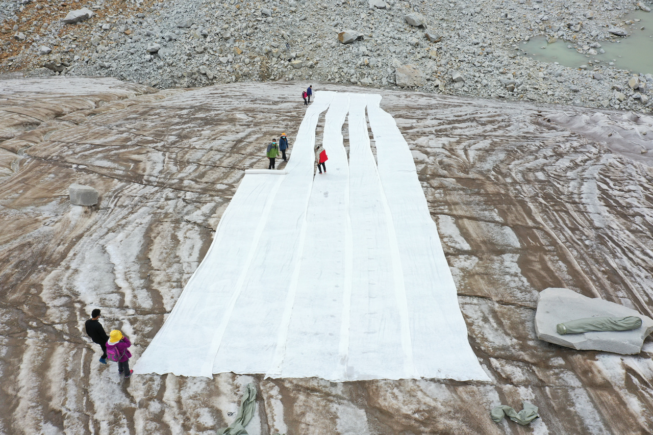 “‘盖被’的原理很简单,就是在冰雪表面覆盖一层隔热反光材料,增大冰面反射率,减少太阳辐射的吸收和冰的表面热交换,从而减缓冰川消融。”王飞腾说。