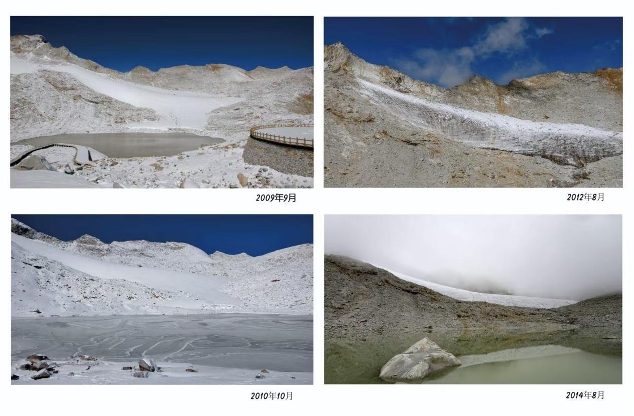 “以前的冰墙有20米,相较于2008年,现在冰崖已经后退了几百米。”张伏表示。从不同时期的冰川图中,可以清晰看到,2005年7月,冰川表面有厚厚的积雪覆盖,透出冰蓝色光泽。而2014年8月,同一位置仅能看到裸露的灰褐色岩石和冰川融水形成的湖泊。