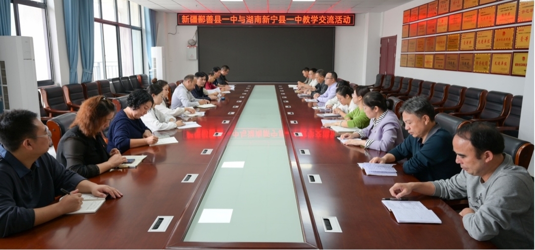 15日,双方就学校管理举行了座谈会。新宁县一中党总支书记蒋礼斌介绍了学校办学历史、办学规模和办学业绩,重点介绍了学校在常规管理、教学教研、德育工作、队伍建设等方面的重要举措和实践经验。鄯善县一中副校长牙森·艾坦木介绍了该校的基本情况,就学校的教育教学、校园文化、年级部管理等问题,与新宁县一中进行了深入探讨和交流。之后,两校相关部门进行对接,就部门工作和工作中遇到的问题进行了交流讨论。