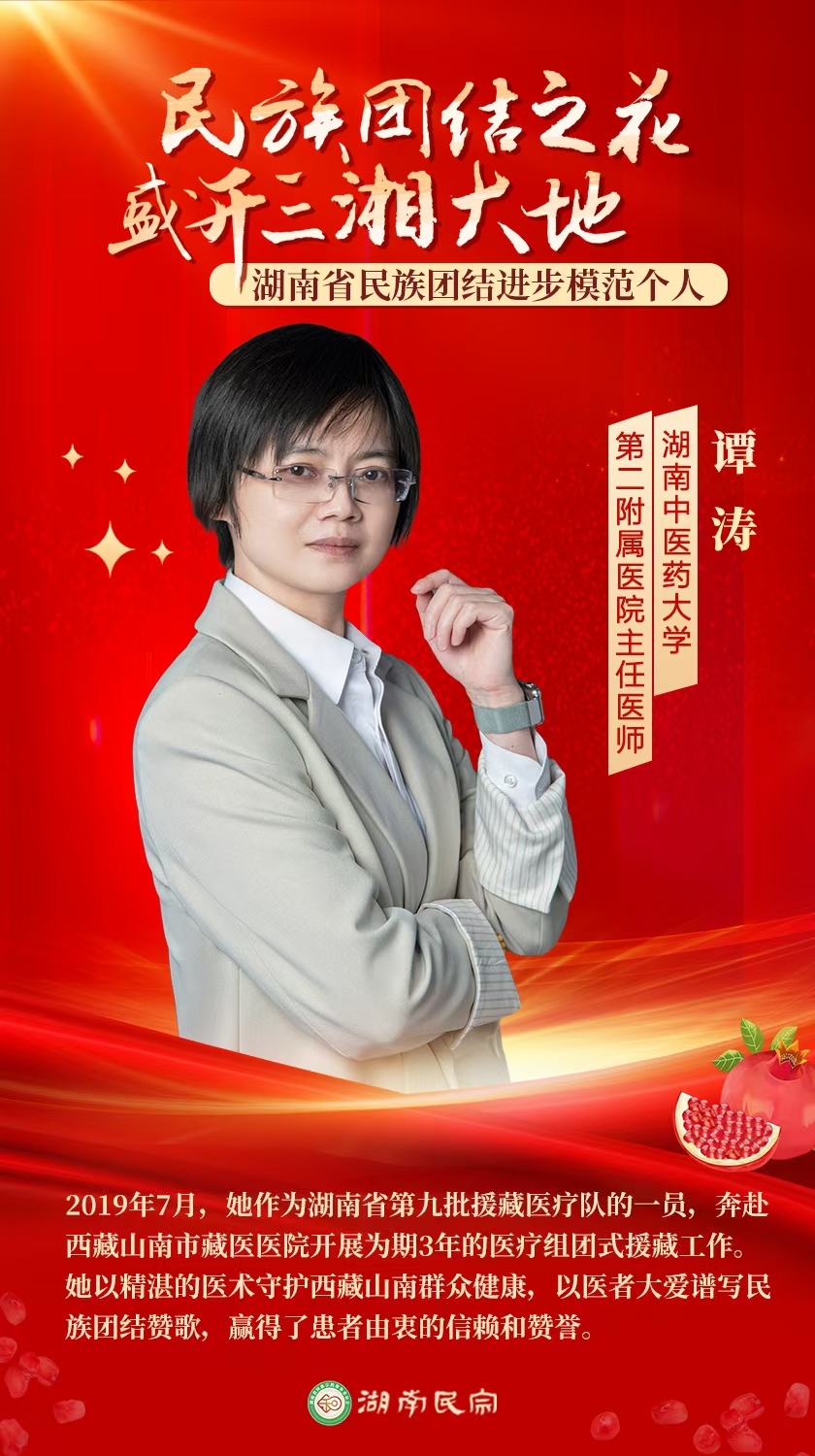 谭涛,湖南中医药大学第二附属医院主任医师。她在西藏山南市藏医医院参加为期3年的医疗组团式援藏工作,以医者大爱谱写民族团结赞歌,2020、2021年度被评为“优秀共产党员”“先进工作者”,树立了湖南援藏医生良好口碑。2025年9月,湖南省委、省政府授予谭涛“湖南省民族团结进步模范个人”称号。