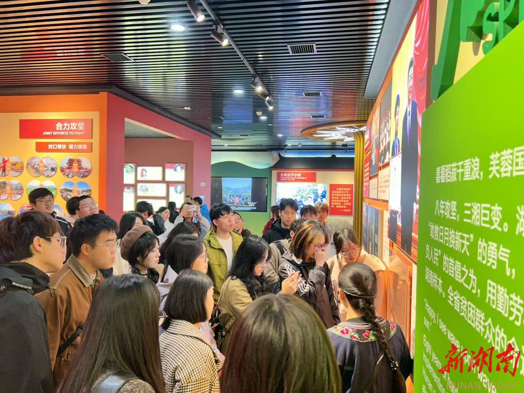 在前往十八洞村的大巴上,同学们通过知识问答进一步了解十八洞村的脱贫历程。抵达后,大家冒雨参观了精准扶贫陈列馆,观看专题短片,深入了解2013年“精准扶贫”理念首次提出的历史场景。沿着“精准扶贫”步道,同学们实地考察了村庄基础设施改造情况,了解村民人均收入、村集体经济等发展数据,切身感受脱贫攻坚带来的巨大变化。