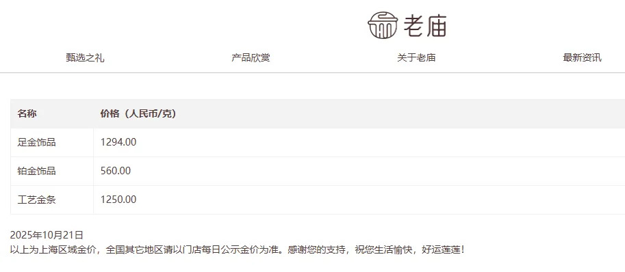 10月21日,国内金饰价格跟涨。老庙黄金足金饰品报价1294元/克,较前一日1258元/克上涨36元/克;周大福足金饰品报价1292元/克,较昨日上涨30元/克;周生生足金饰品标价1289元/克,较前一日上涨27元/克。