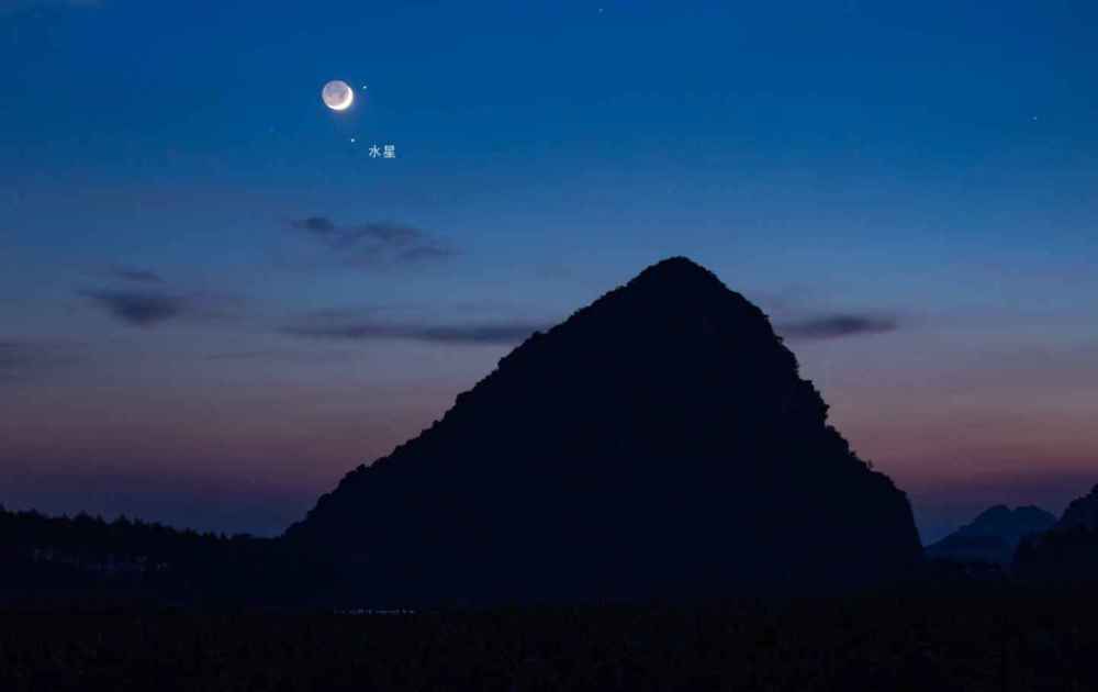 23日21时,火星合月;24日零时,水星合月。23日日落时分,在西南方同一片天区,火星、水星和蛾眉月会近距离“相遇”并形成“双星拱月”之势,其中,火星的地平高度最高,水星其次,蛾眉月最低。