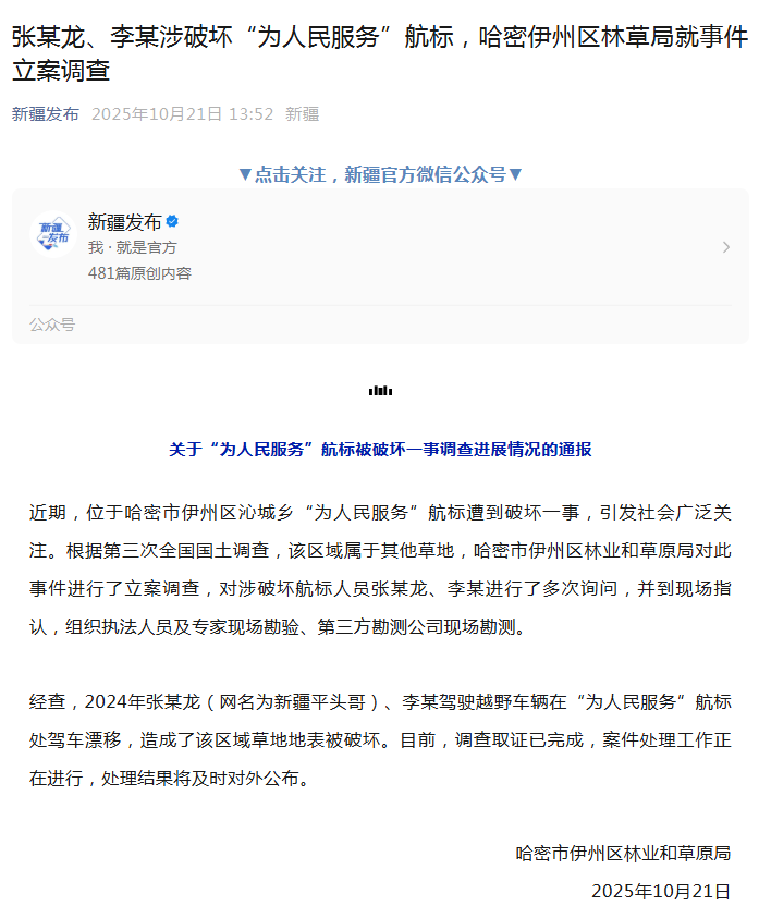 经查,2024年张某龙(网名为新疆平头哥)、李某驾驶越野车辆在“为人民服务”航标处驾车漂移,造成了该区域草地地表被破坏。目前,调查取证已完成,案件处理工作正在进行,处理结果将及时对外公布。
