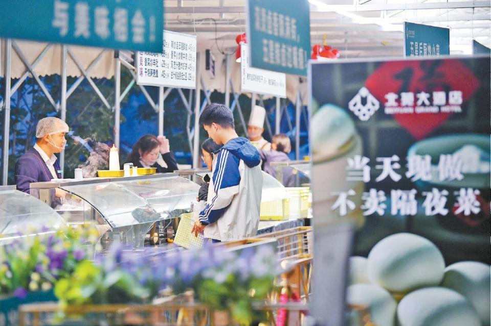 位于望京的昆泰嘉晟酒店,更是承包了周边白领们的“一日三餐”:早餐时段,手工包子、热豆浆可随手带走;午餐推出无预制菜工作套餐;晚餐则摆上热卤、小吃。只见现场厨师娴熟分装各种饭菜,服务员热情地向顾客们介绍商品、解答疑问,让这种“星级摆摊”多了份温馨。“五星级酒店出品,吃着放心,下班回家也不用开火了,多好!”白领张女士边选购凉菜边说道。