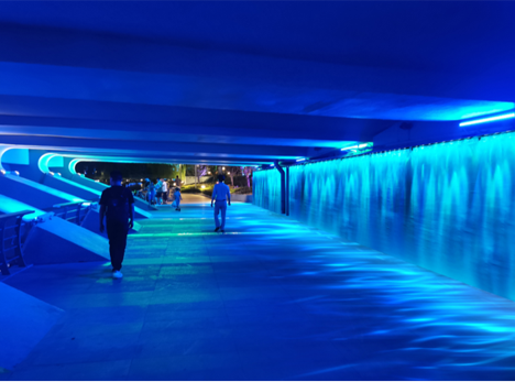 “水之灵”将通道变为“水下光廊”。定制水纹灯投射光线于步道与墙面,模拟水波流动,行人经过时地面光影荡漾。它呼应亮马河亲水文化,重新定义人、空间与河流的关系,成为市民亲水记忆点。