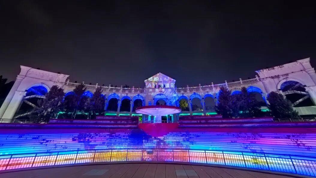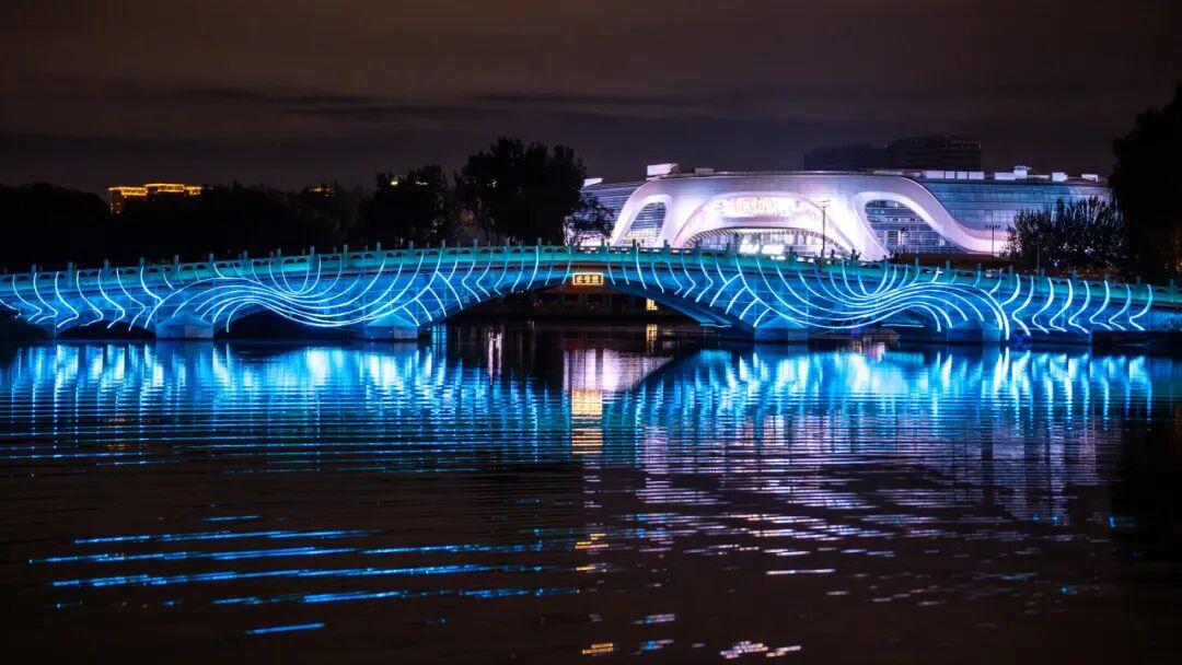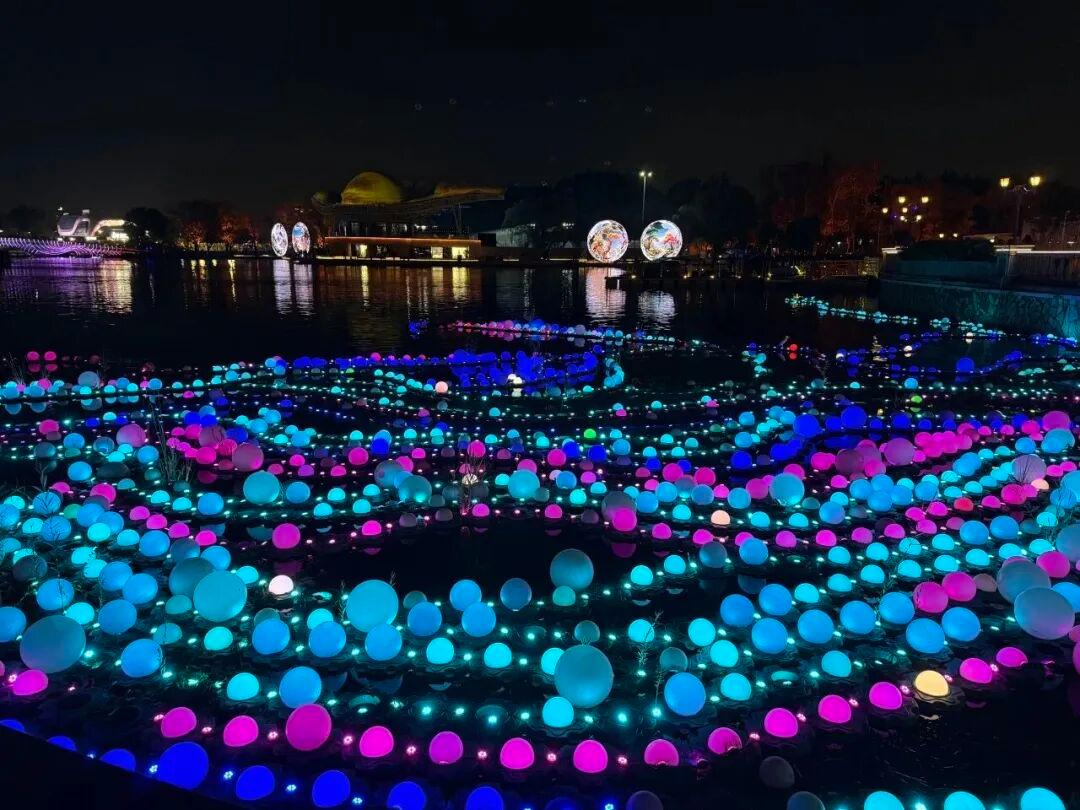 “花栖水漾”装置,是灯光消费季水上追光专线焦点。白天,桥体以极简轮廓融入自然;入夜,流线型灯光沿桥体流淌,模拟水波荡漾与花朵绽放,与水中倒影交织,打造“一桥流水,昼夜双景”的诗意场景。