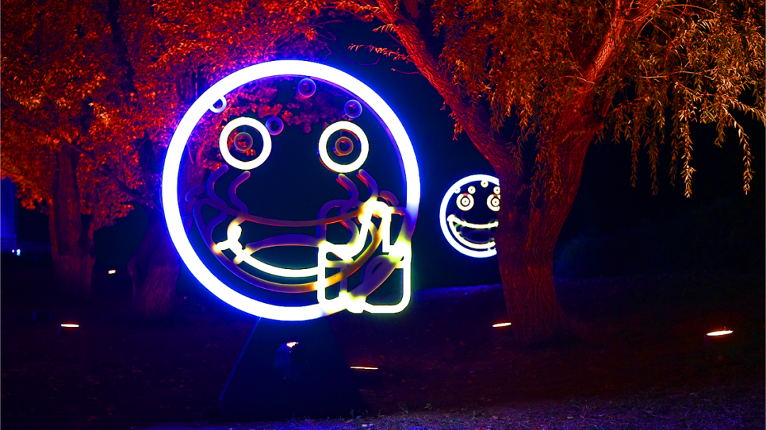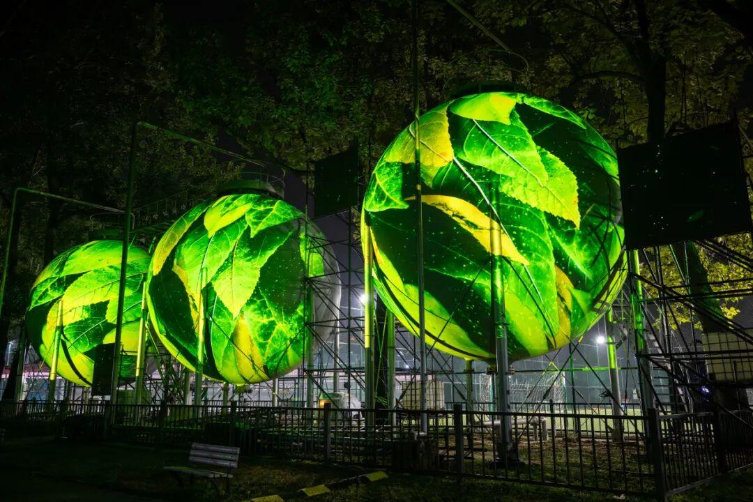 在朝阳规划艺术馆南侧,三座直径约5米的球形储气罐被光影悄然唤醒,作品“奇幻摩球”运用前沿球幕投影与互动LED技术,让数字光影在球面上流淌、跳跃,将工业遗产转化为瞬息万变的奇幻艺术载体,唤醒工业遗存新活力。