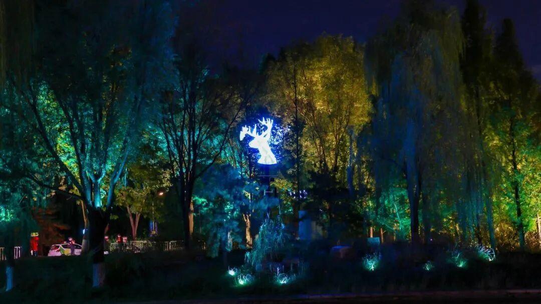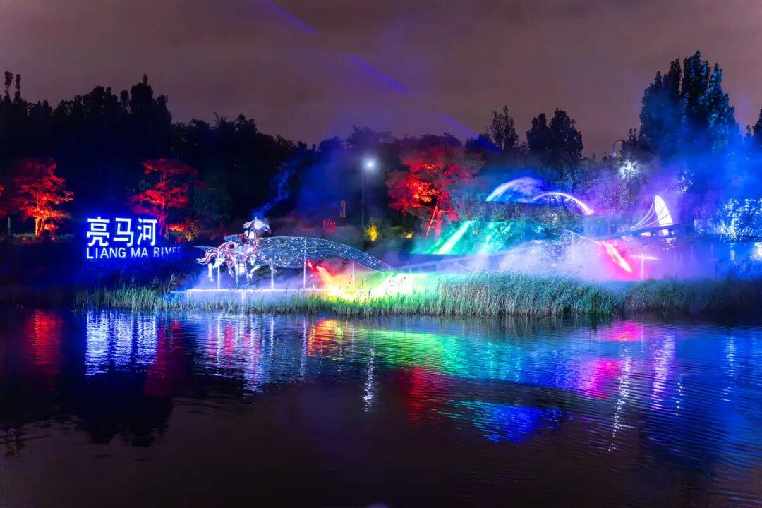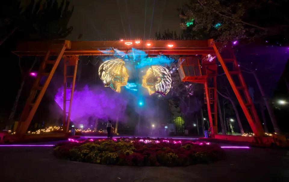 “遇见”位于朝阳公园东部,以郁金香花园为背景,用小龙门吊悬挂可滑动双人光影雕塑,借机械滑轨模拟相遇、相知到分离的情感历程。灯光随情绪变化,不远处千盏萤火虫灯打造光海。它融合机械理性与艺术感性,唤起人们对相遇的共鸣,诠释“相遇”是时光里的奇迹。