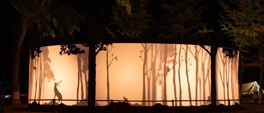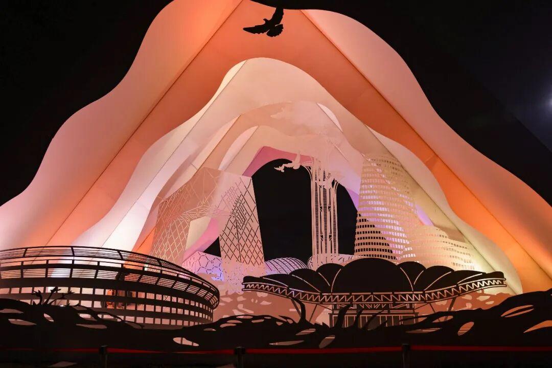 “幻光之山”作品内部以六层“仿剪纸”图案叠合构建时空轴线:北侧三层刻画天坛、东岳牌楼等古都符号,南侧三层勾勒CBD、奥林匹克塔等现代地标。游客可沉浸于东方韵味的剪纸光影中拍照打卡,当灯光穿透镂空图层,历史与当代在光影中交错拼贴,形成一条贯穿北京文脉的视觉通道。