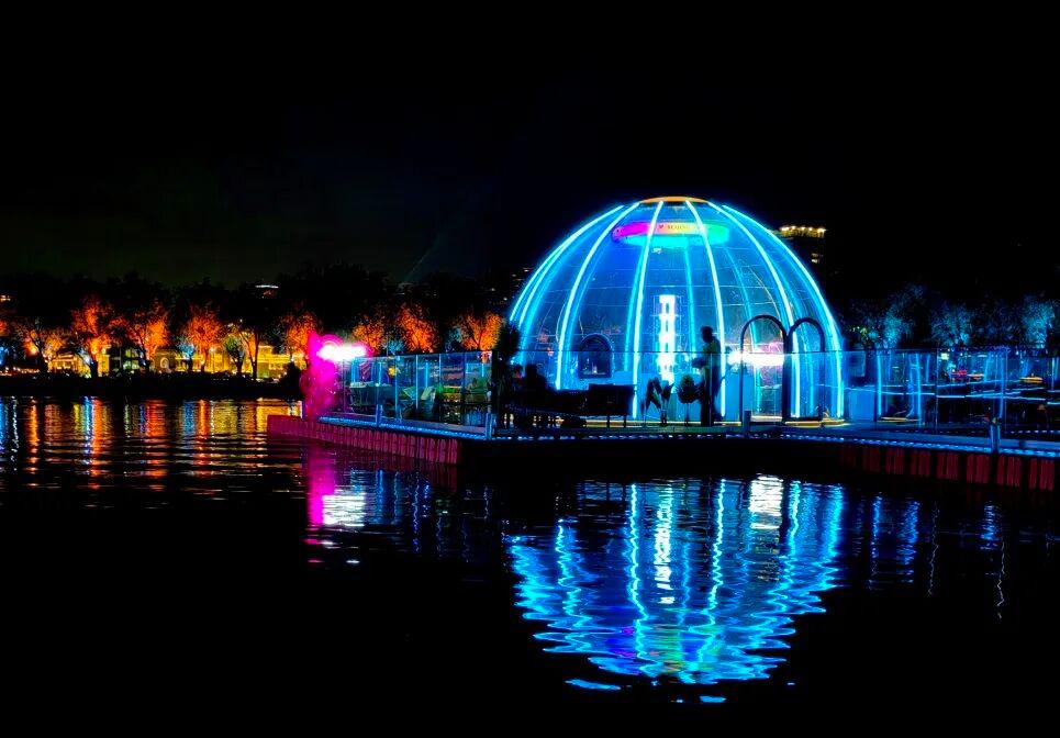 “孤独星球”以未来感透明穹顶星空泡泡屋为核心,内设INS新乐园酒水调饮服务与中央吧台。外侧四组卡座临水而设,柔和灯带营造时尚氛围,适合闺蜜小聚、情侣约会打卡。它融合自然景观与都市美学,既满足年轻群体社交需求,也是都市人逃离喧嚣的疗愈空间。