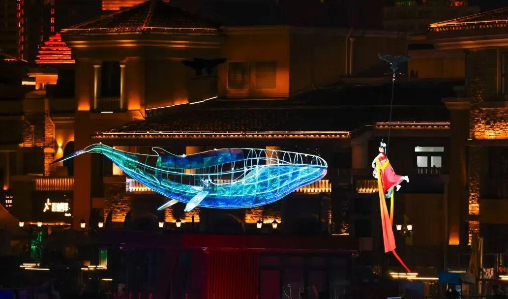 暮色中,10米长“鲲鹏”光影装置沿机械轨道游弋,四组 LED巨幕展《百骏图》。160米高空威亚横跨贝壳剧场水域上空,表演者凌空起舞,串联文化、自然与城市,谱写亮马河人与自然和谐共生的生命乐章。