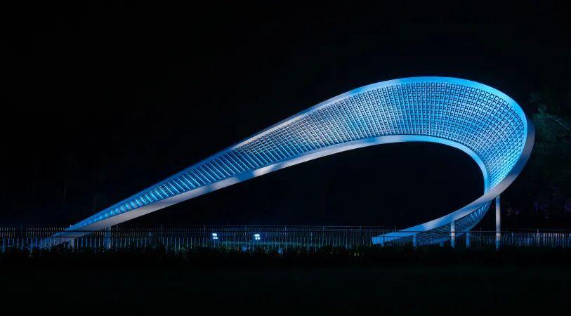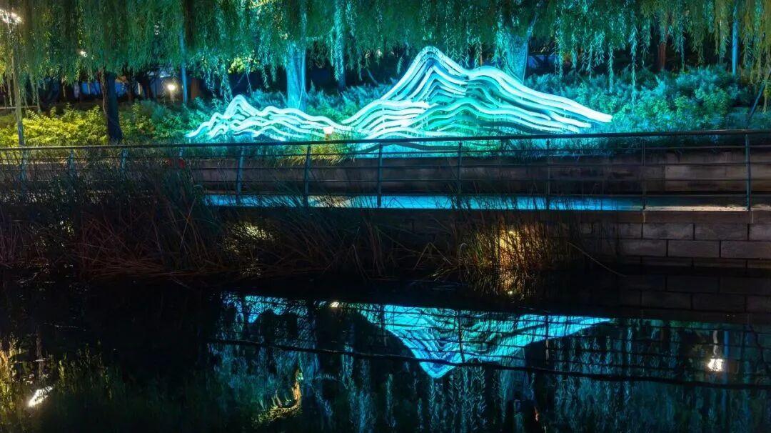 “金线银线”位于临近亮马河观澜桥的河岸绿地,以光影艺术巧妙勾勒出雕塑流线型的唯美形态,在表面投射出本届灯光消费季的主题词,将艺术观赏与活动主题完美融合。该作品原是献礼北京2022年冬奥会的作品之一,如今通过光影赋能焕发新生。